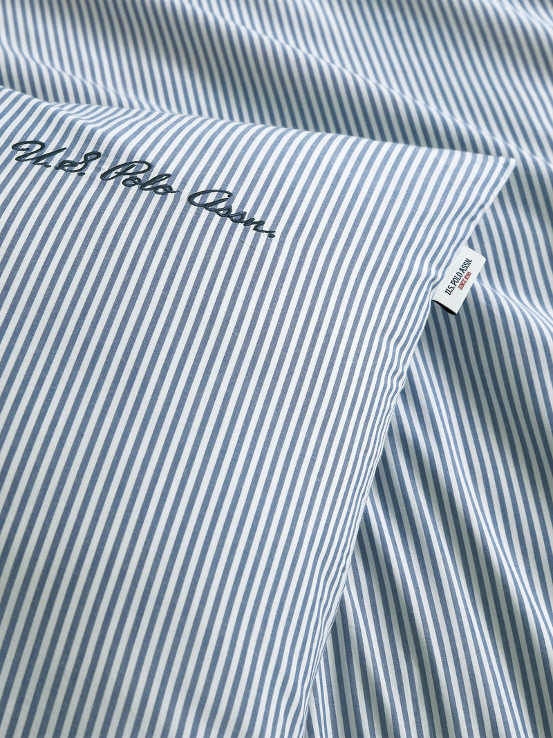 Elevate your bedroom with the U.S. Polo Assn. Pure Cotton Stripe Duvet Set. Made from 100% cotton with a luxurious 200 thread count, this set offers a soft, breathable feel. The crisp striped design exudes classic style, complemented by the signature embroidered logo and branded tab details for a refined touch. Perfect for those who appreciate understated elegance, pair it with solid-toned throws or pillows for a polished, timeless aesthetic.