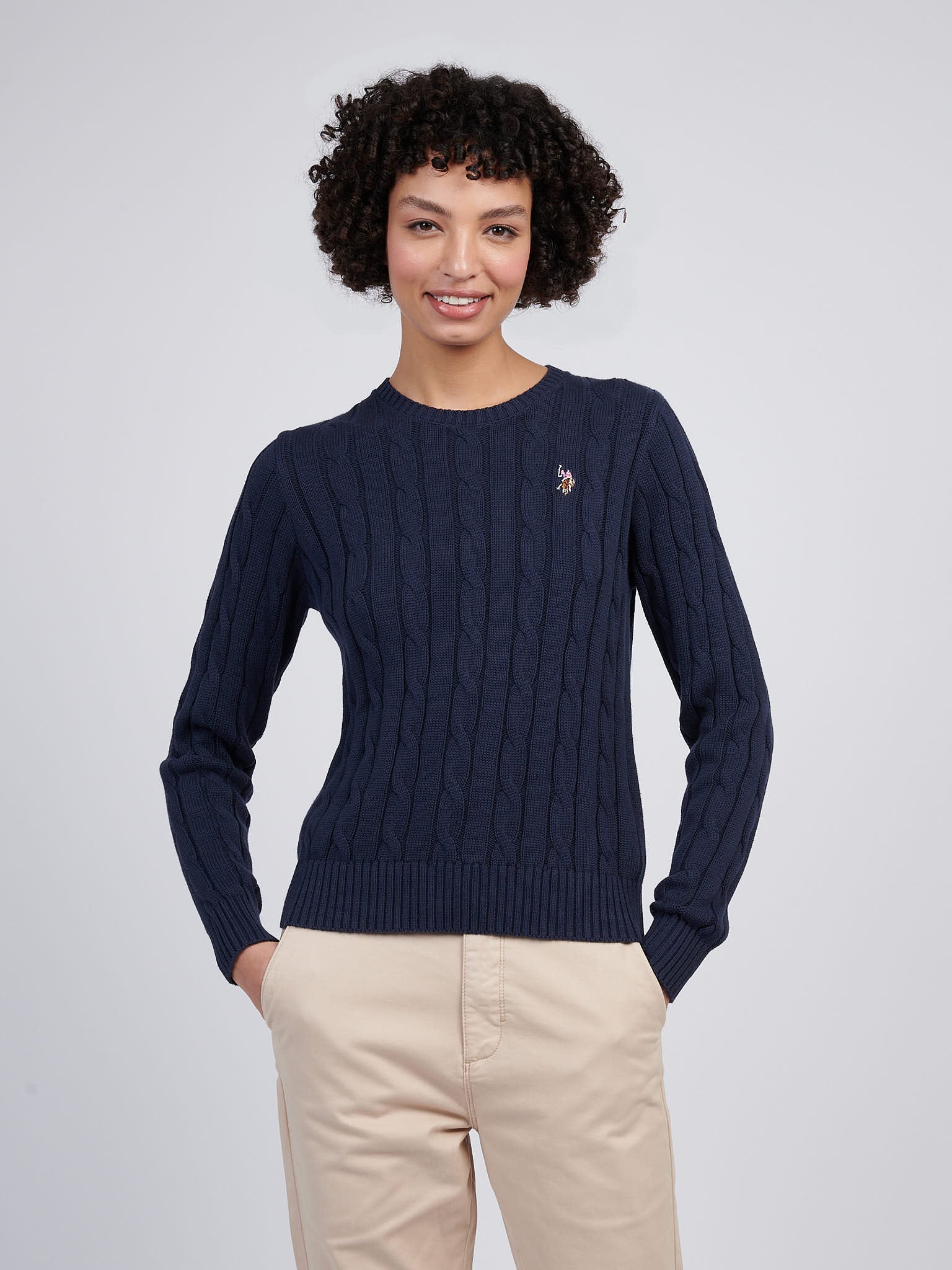 Elevate your essentials with the U.S. Polo Assn. Womens Crew Neck Cable Jumper. Crafted from a soft cotton blend with a classic cable knit, this piece combines timeless style with cosy comfort. Perfectly paired with tailored trousers for a sophisticated touch or layered over jeans for effortless weekend wear.