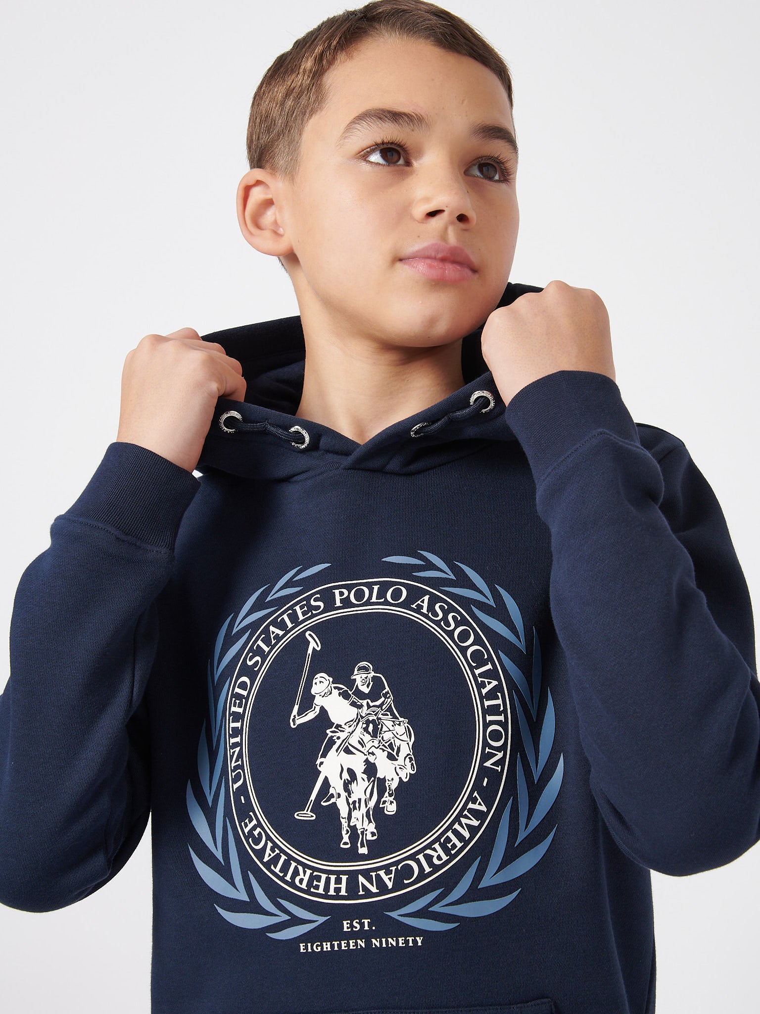 Discover the U.S. Polo Assn. Boys Crest Graphic Hoodie, where comfort meets heritage in a sophisticated design. Crafted from a luxury cotton blend, this classic-fit hoodie features a bold high-build crest logo celebrating the brands legacy. Pair with well-fitted jeans and sneakers for a timeless, relaxed look that exudes both style and comfort.