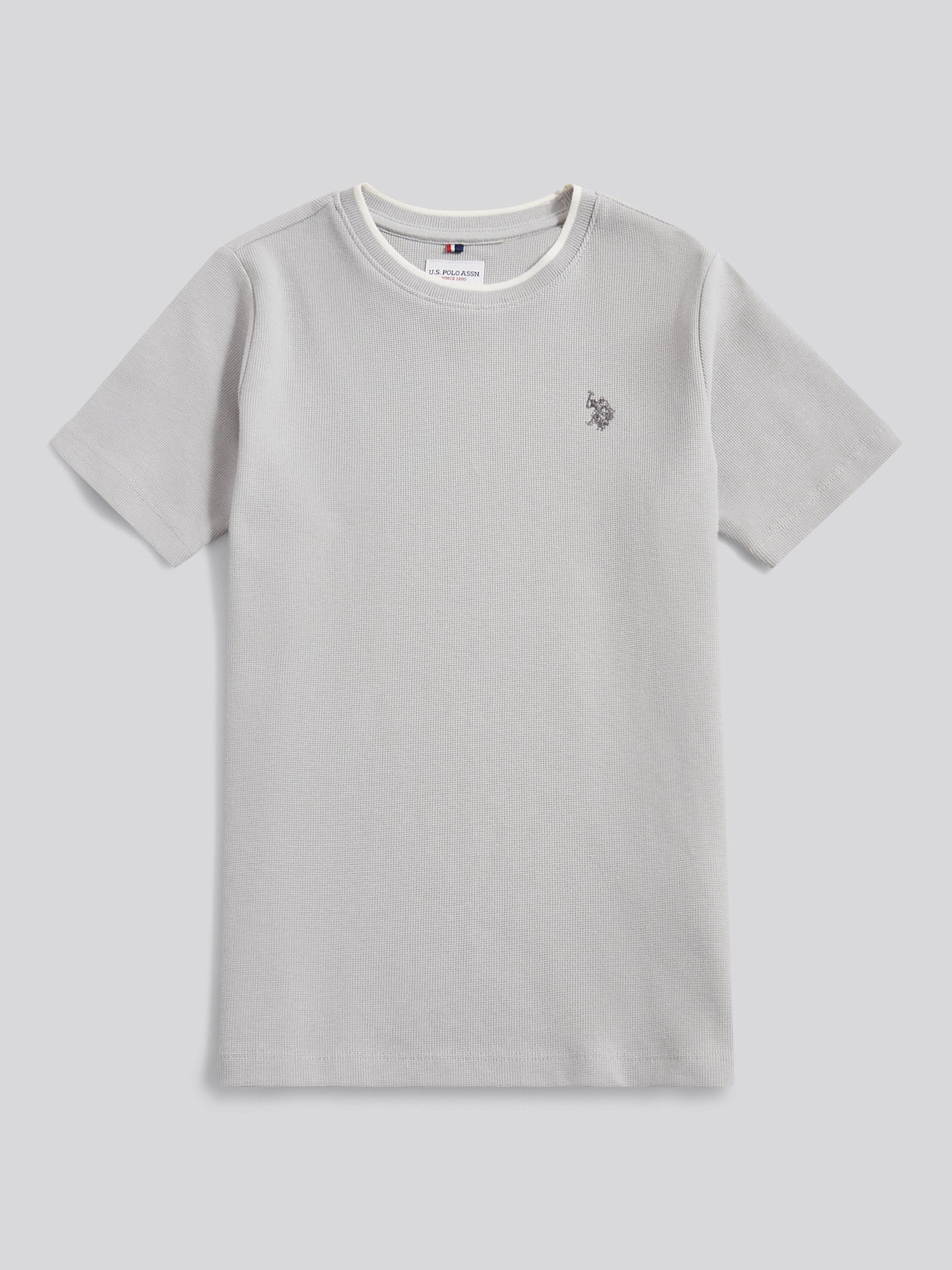 Elevate everyday looks with the U.S. Polo Assn. Boys Knit Texture T-Shirt. Featuring a refined pique knit texture and contrast tipping at the collar, this elevated staple brings subtle sophistication to off-duty dressing. Wear it with cargo shorts or chinos for a clean yet confident warm-weather outfit.