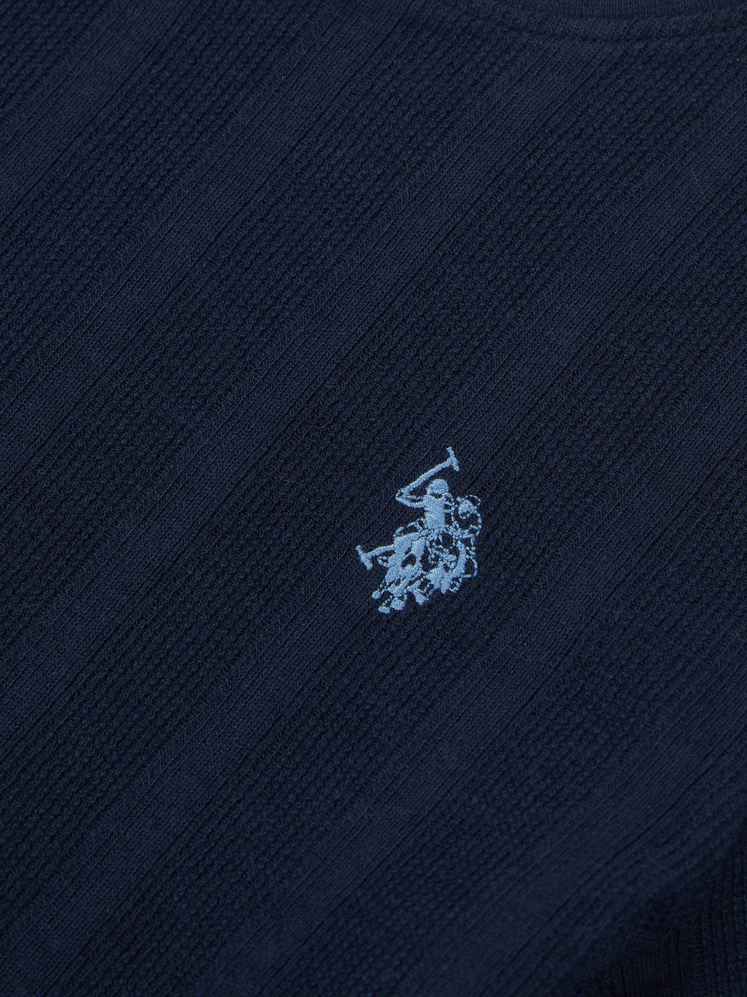 Introduce a touch of modern texture into his wardrobe with this refined vertical stripe tee from U.S. Polo Assn. A perfect balance of style and comfort, it's ideal for everyday outings or casual gatherings. Pair with jeans or chinos for a versatile look.