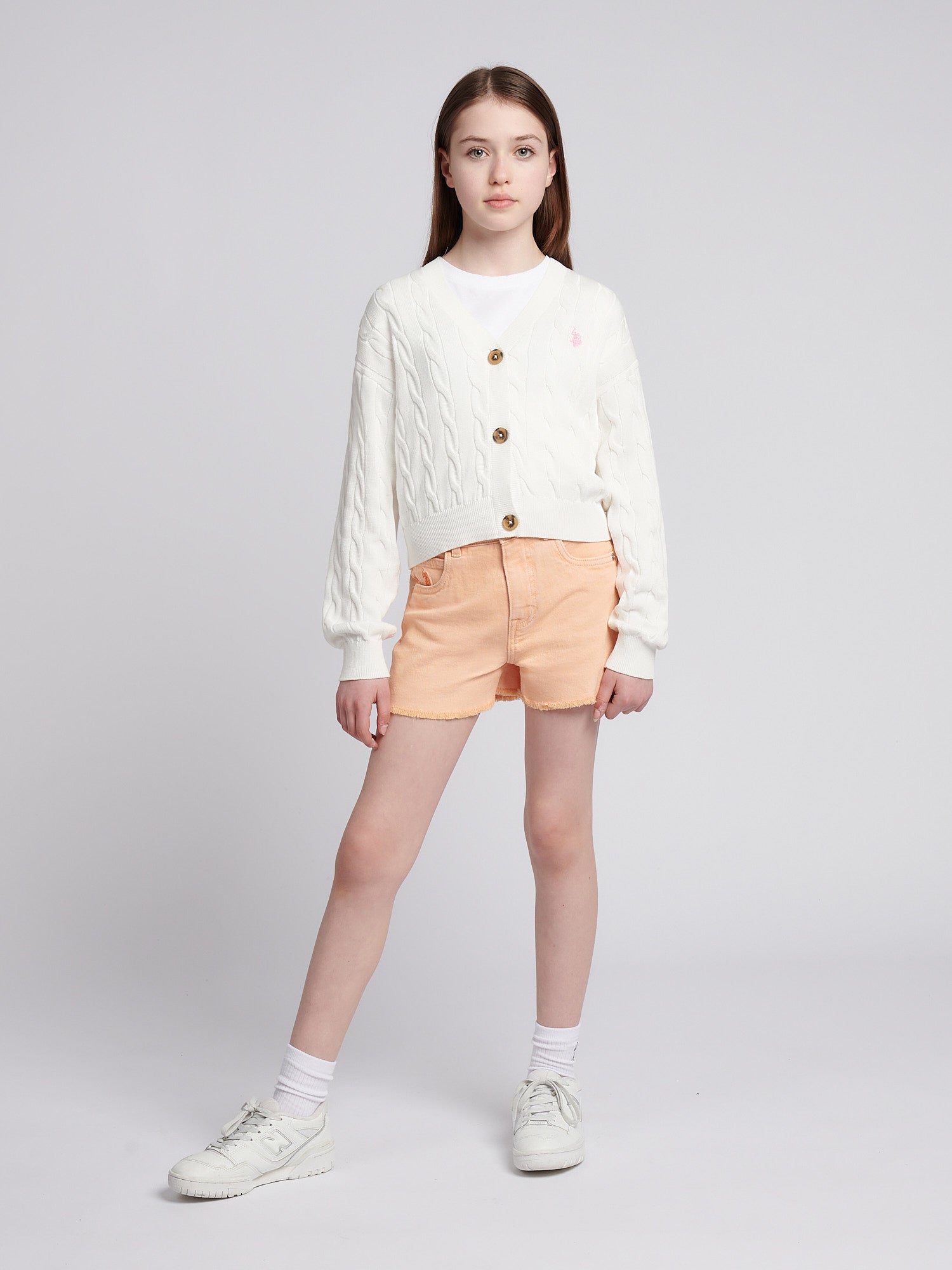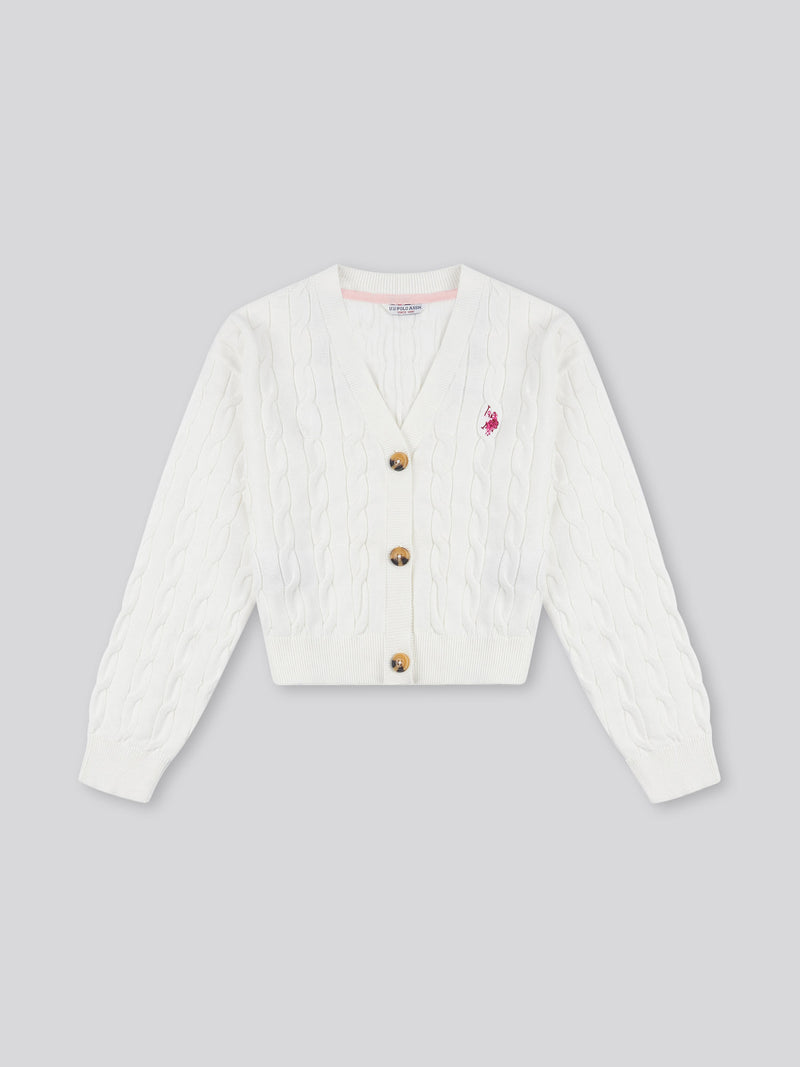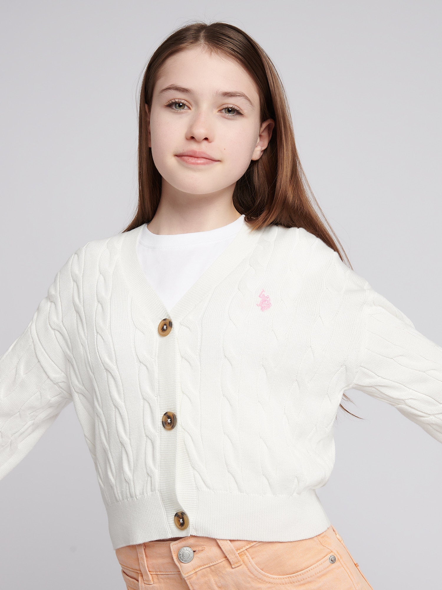 Elegant and charming, the U.S. Polo Assn. Girls Cable Knit Cardigan is crafted in a classic cable knit pattern designed to elevate and smarten up any outfit.