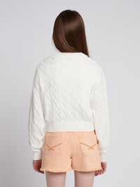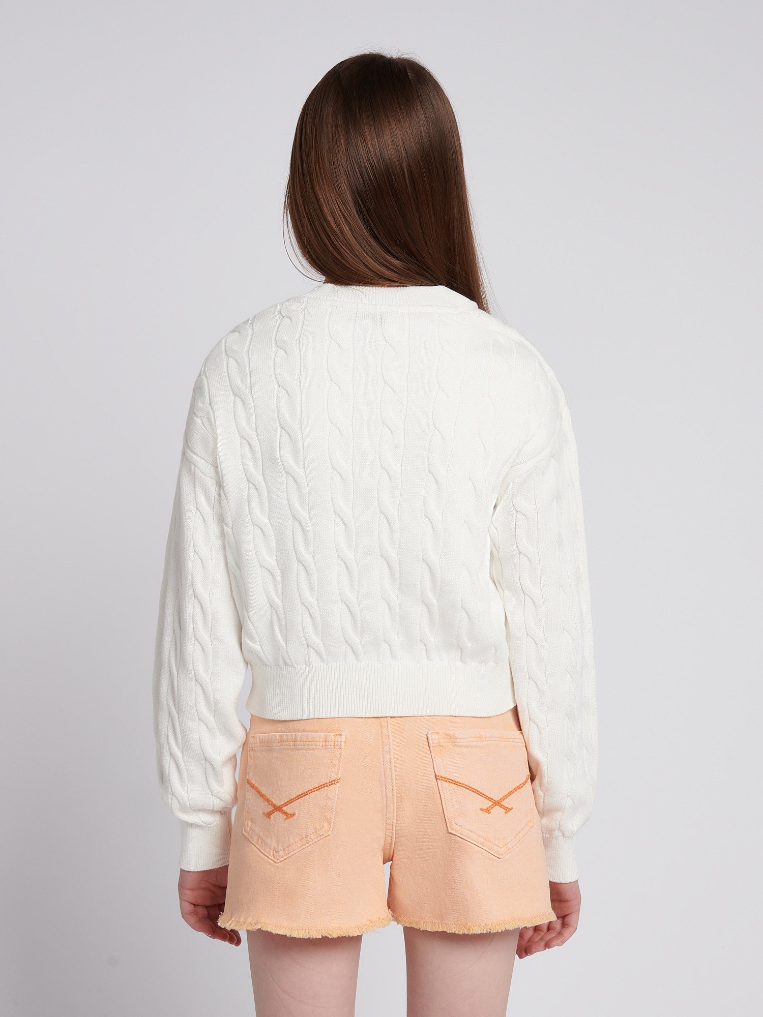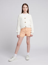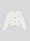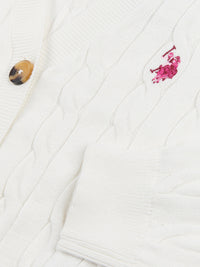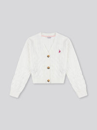 Introduce her to timeless style with this beautifully crafted cable knit cardigan, designed to blend elegance with practicality. Made from luxury pure cotton, this piece is as comfortable as it is sophisticated. The intricate cable knit pattern and subtle rib detailing provide a classic touch, while the branded horn-effect buttons add a refined finish. Pair with a flowy skirt for a polished look or layer over a casual dress for effortless charm.