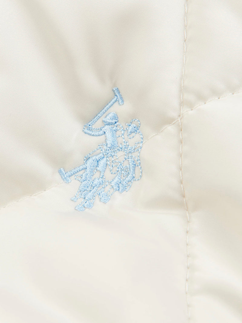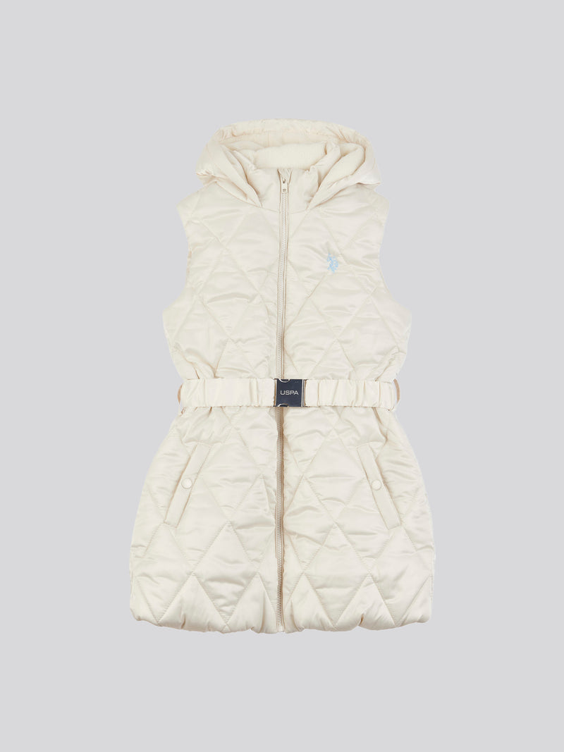 The U.S. Polo Assn. Girls Longline Puffer Gilet is a classic layering piece featuring a fun diamond quilt design with faux down padding, a detachable satin fabric belt with metal engraved buckle fastening for a secure fit, a warm funnel neck design, and a contrast lining hood to keep you warm. This stylish body warmer vest features 2 front pockets and an internal chest pocket and a durable water-repellent coating making it suitable for wearing all season long. This outerwear piece is complete with the signature double horsemen logo embroidery on the left chest for the USPA stamp of authenticity. This jacket has a regular fit.
