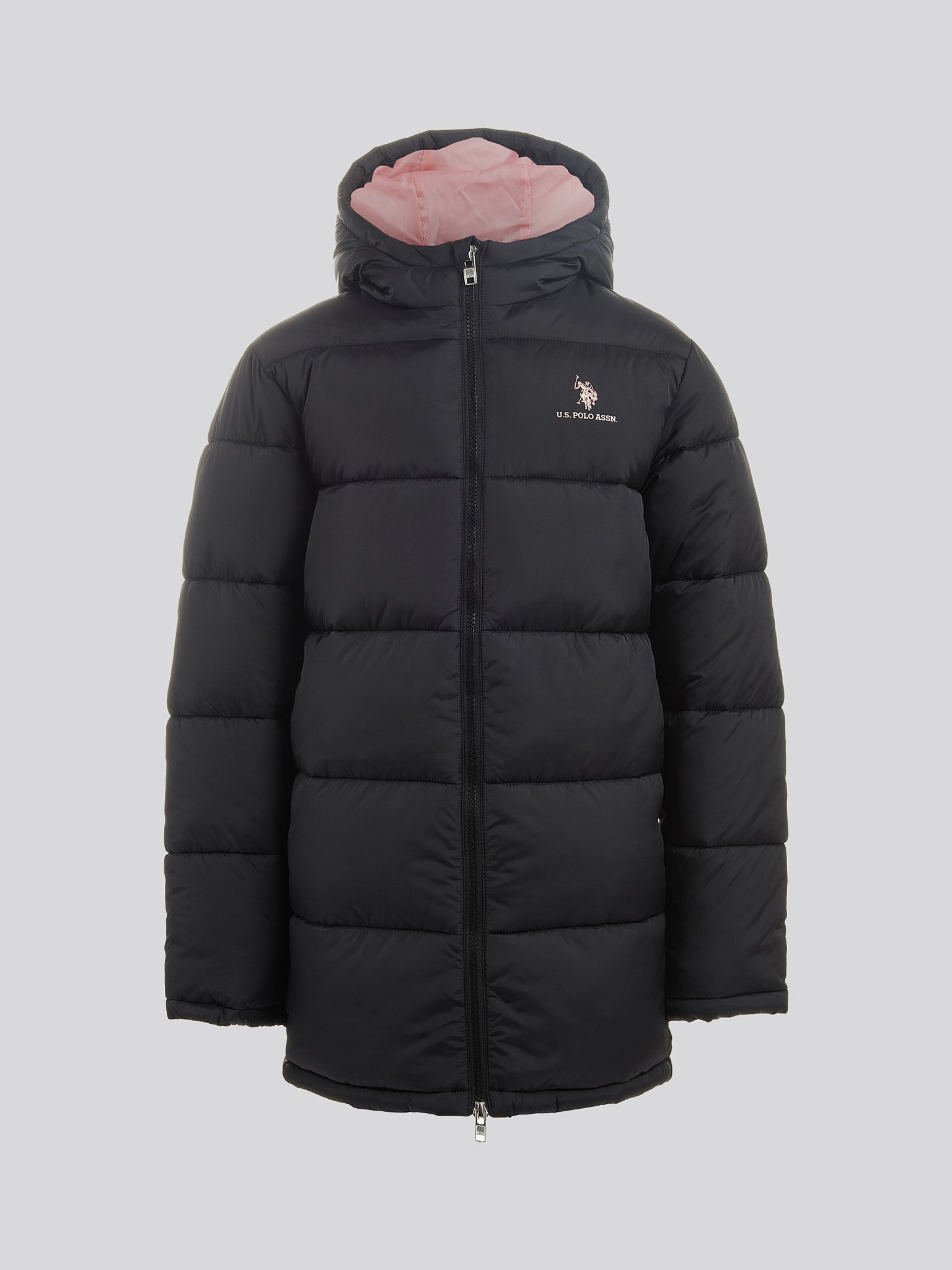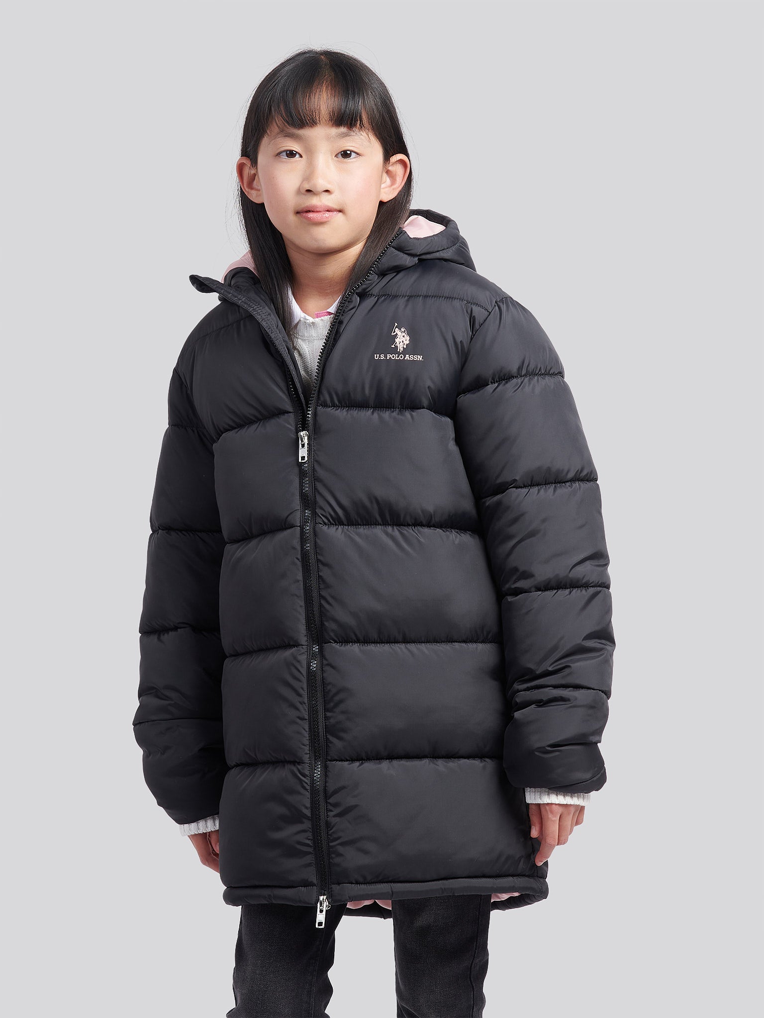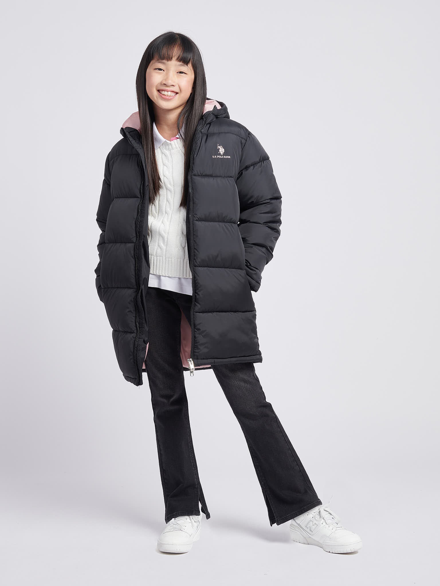 Ensure your little one stays cosy and stylish with the U.S. Polo Assn. Girls Longline Puffer Jacket. This jacket pairs wonderfully with a casual outfit like jeans and boots for an effortlessly chic look, perfect for school or winter strolls.