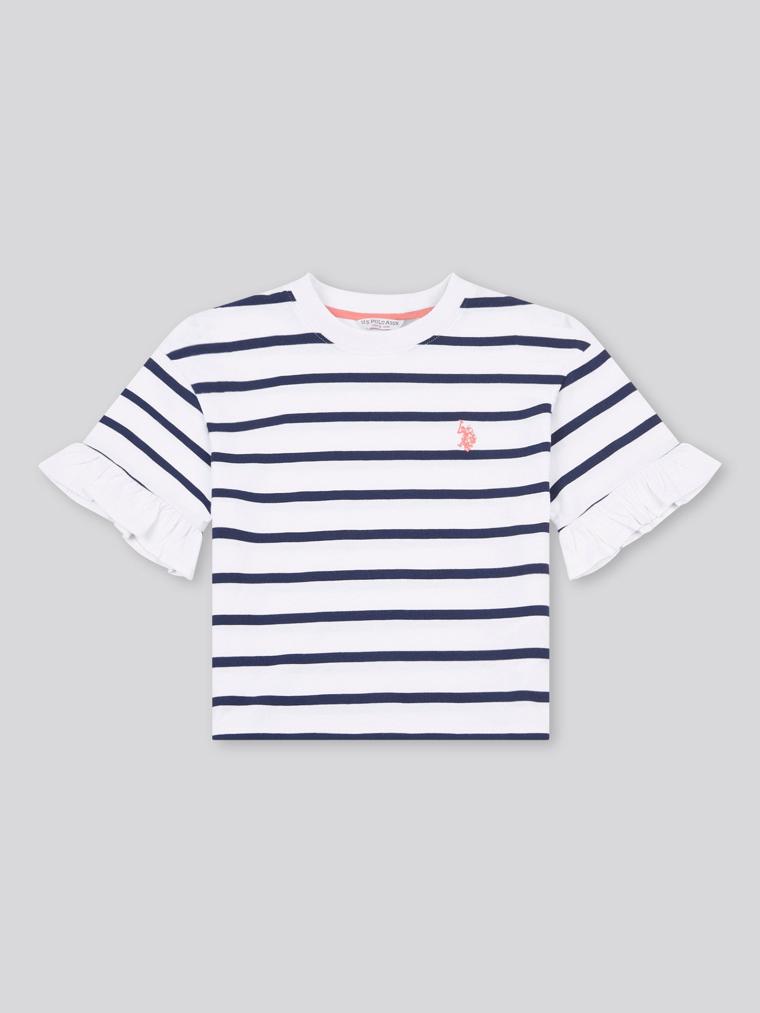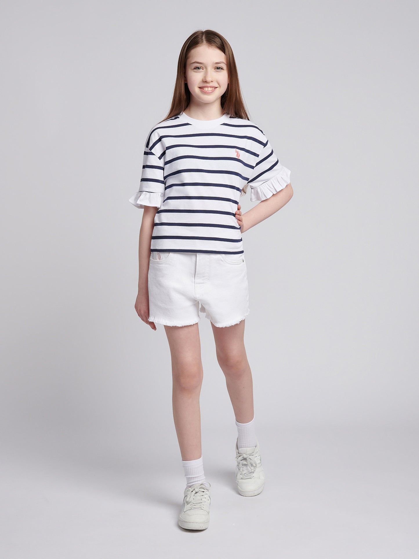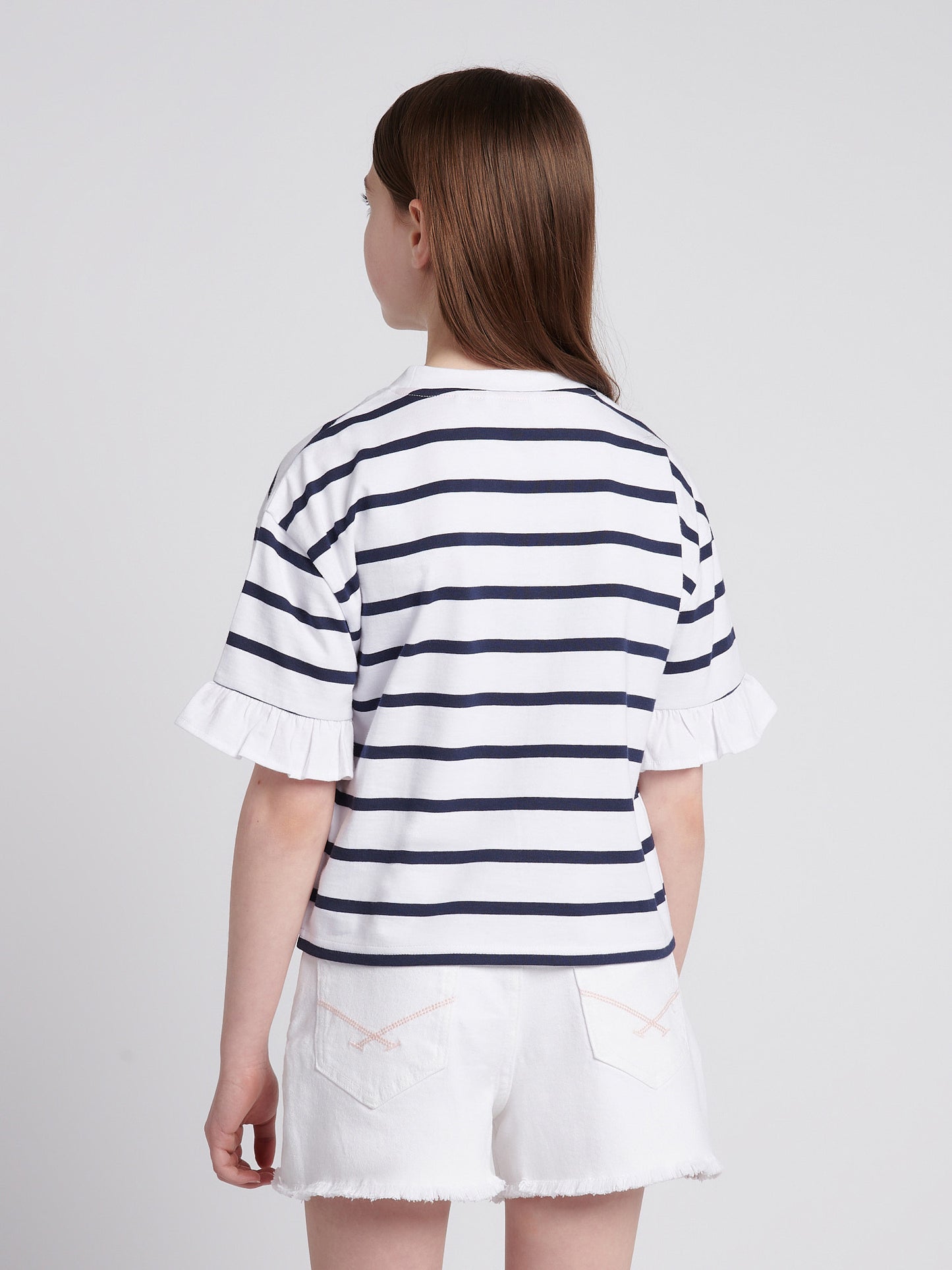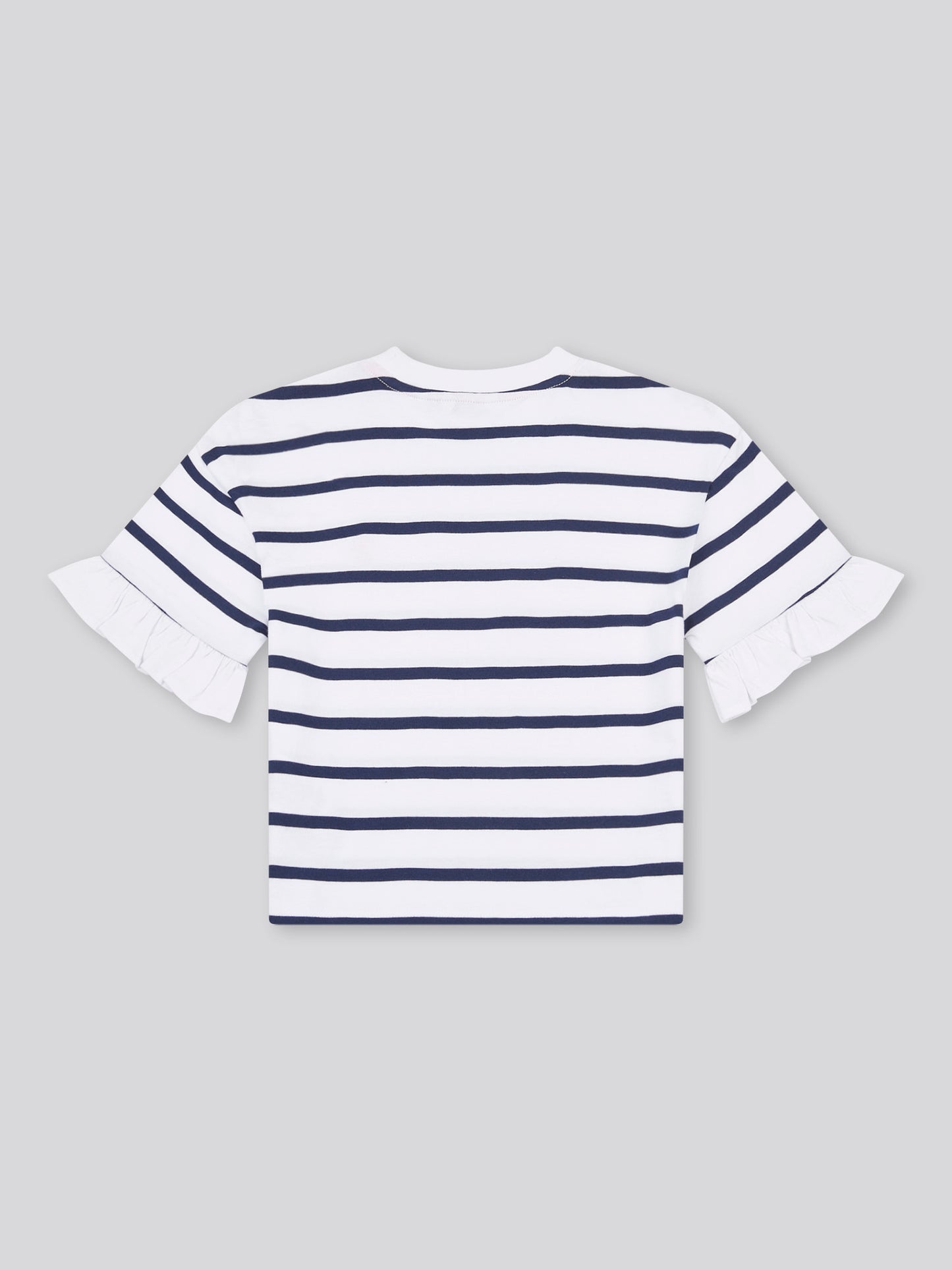 Girls Stripe Frill Cuff T-Shirt in Bright White