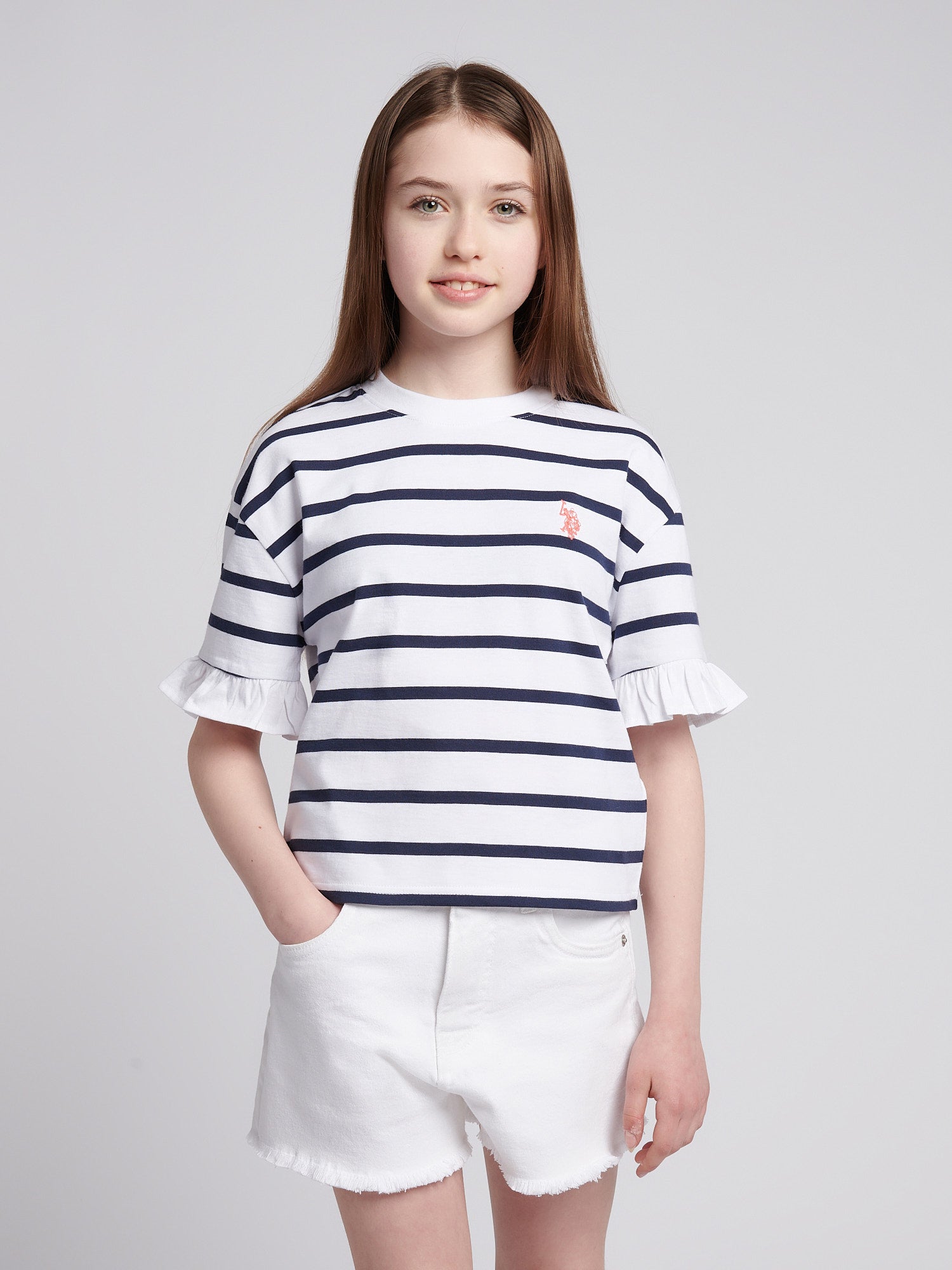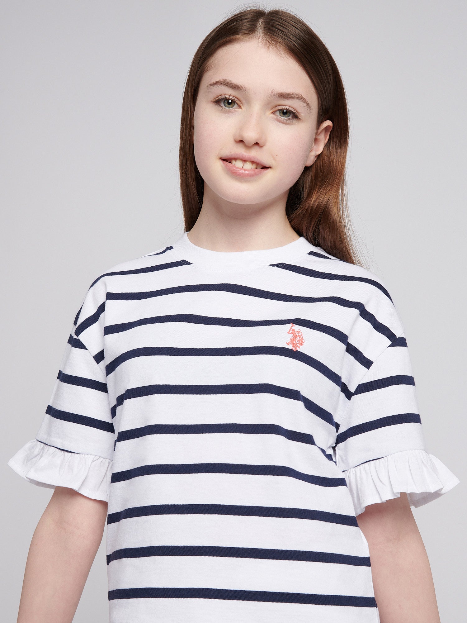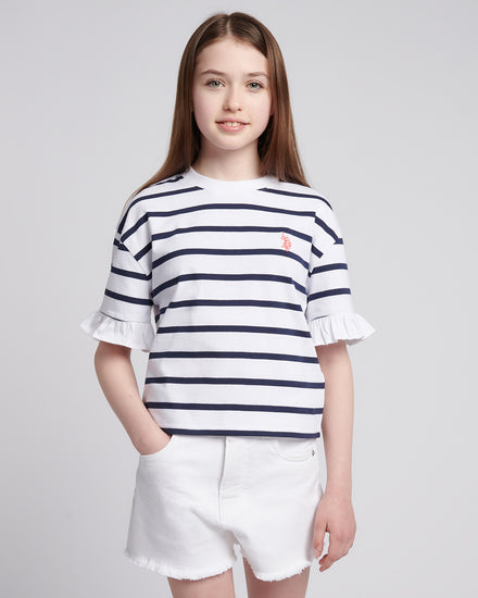 Elevate her everyday wardrobe with this timelessly charming stripe frill cuff T-shirt, a piece that effortlessly blends classic design with playful detail. Designed to reflect the heritage of the sport of polo, this top features fine stripes and delicate frill cuffs, adding a refined touch to casual styling. Pair it with jeans for a relaxed weekend look or layer it with a cardigan on cooler days.