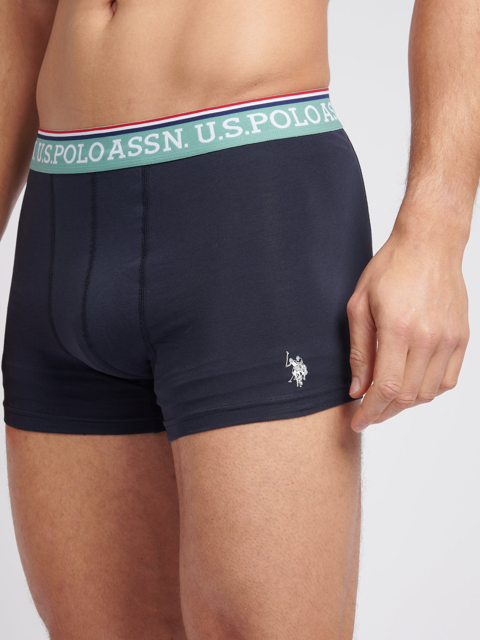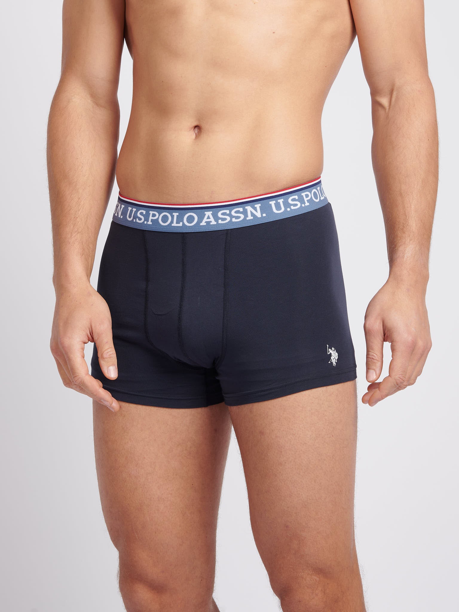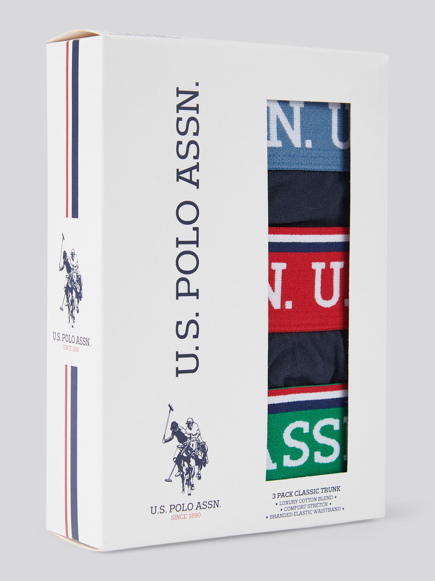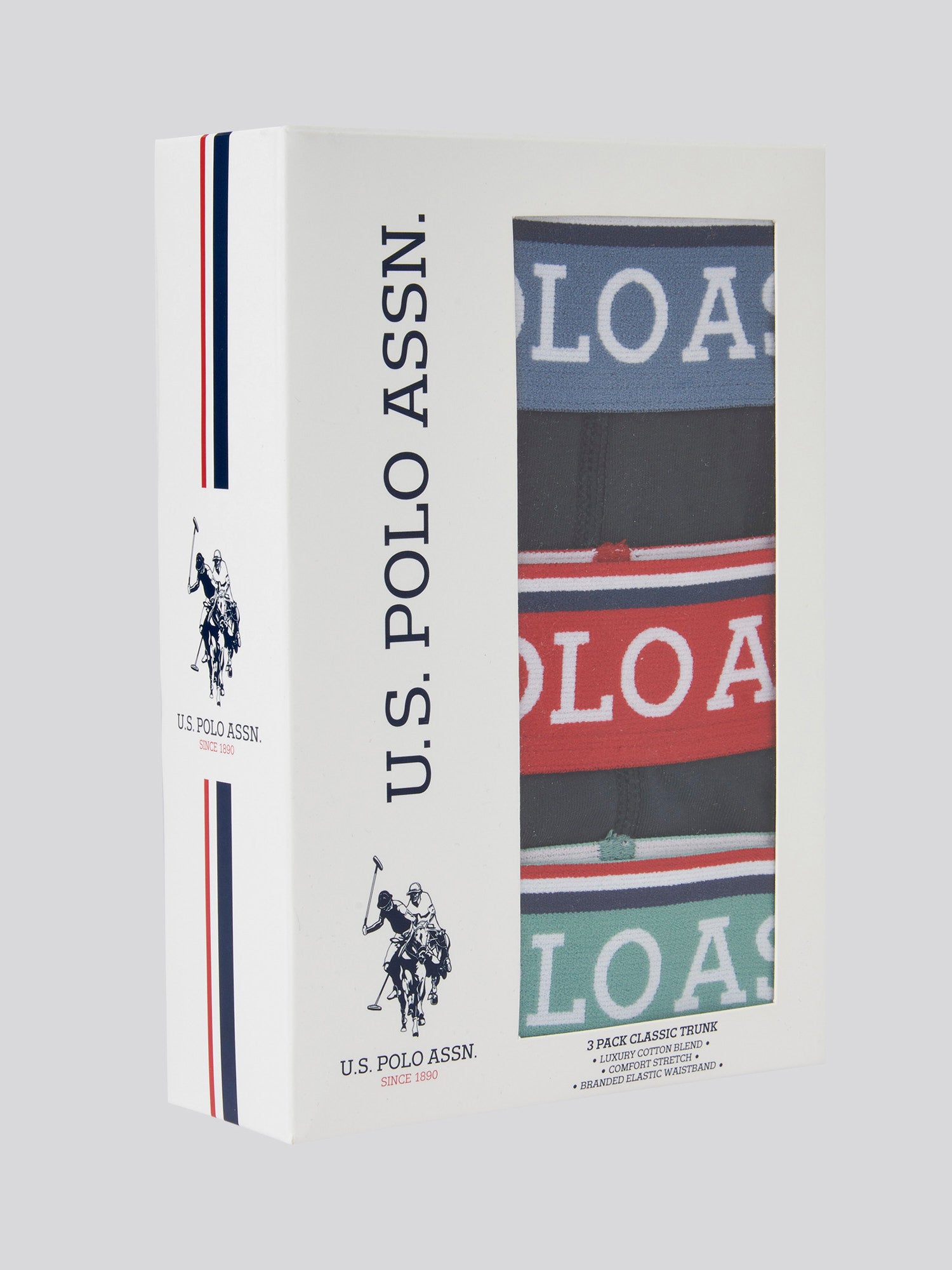 Refresh your essentials with the U.S. Polo Assn. Mens 3 Pack Brand Highlight Boxer Shorts, designed for comfort and style every day. Made from soft, stretchy cotton jersey, these boxers feature a secure fit with a flat elasticated waistband, accented by signature branding for a classic touch. An embroidered double Horsemen motif on the leg adds a stamp of authenticity.
