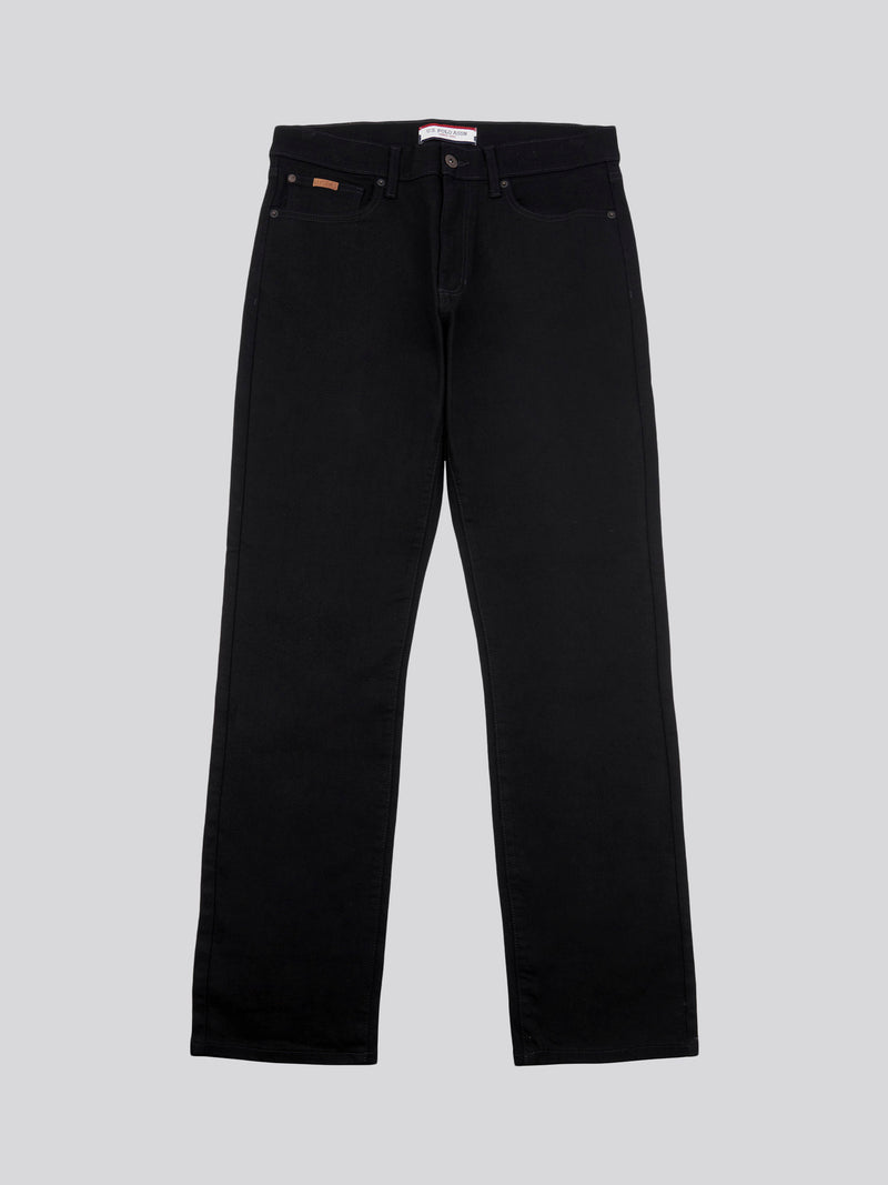 The U.S. Polo Assn. Mens 5 Pocket Regular fit Denim Jeans are crafted in a medium-weight, cotton stretch fabric for ease of movement and comfort. The classic denim features 5 pockets, rivets and branded metal wear, zip and button closure and double stitch detail for everyday durability and style. Complete with the signature mallet cross on the back pockets, a branded jacron, and a signature USPA tab on the front coin pocket for the USPA stamp of authenticity. The jeans have a regular straight leg fit with a regular leg length of 32 inch.