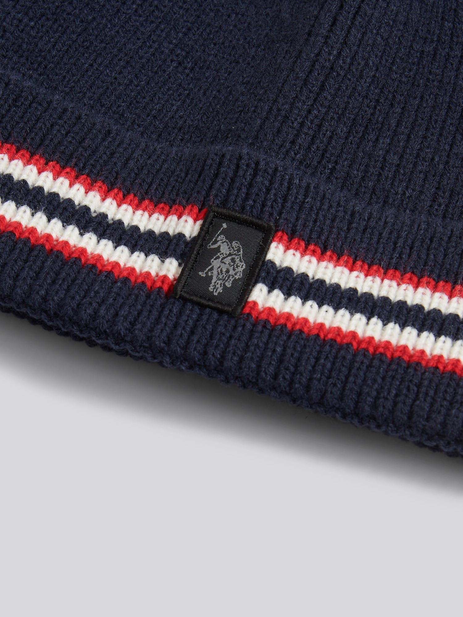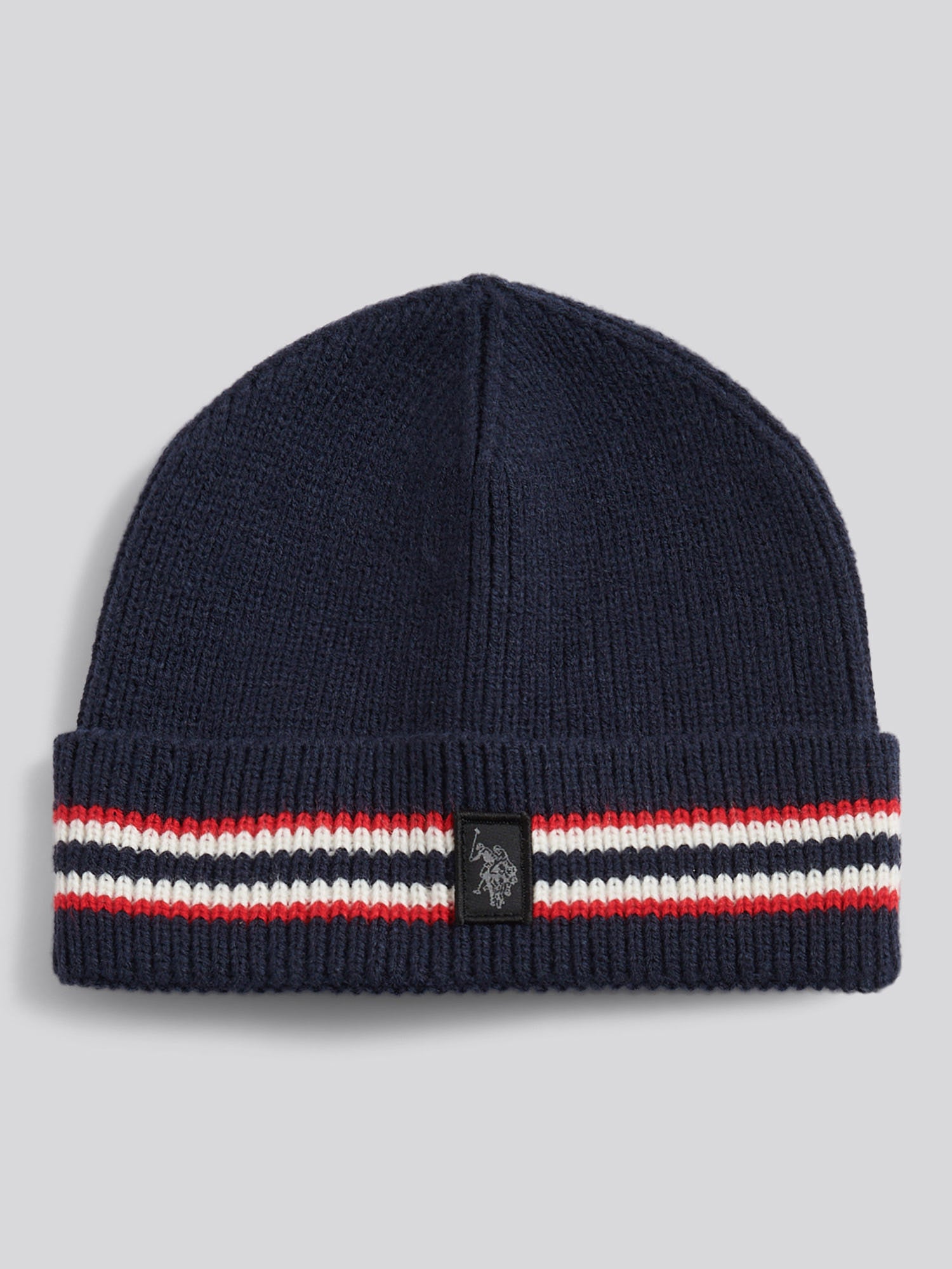 Mens Brand Stripe Knit Beanie in Dark Sapphire Navy