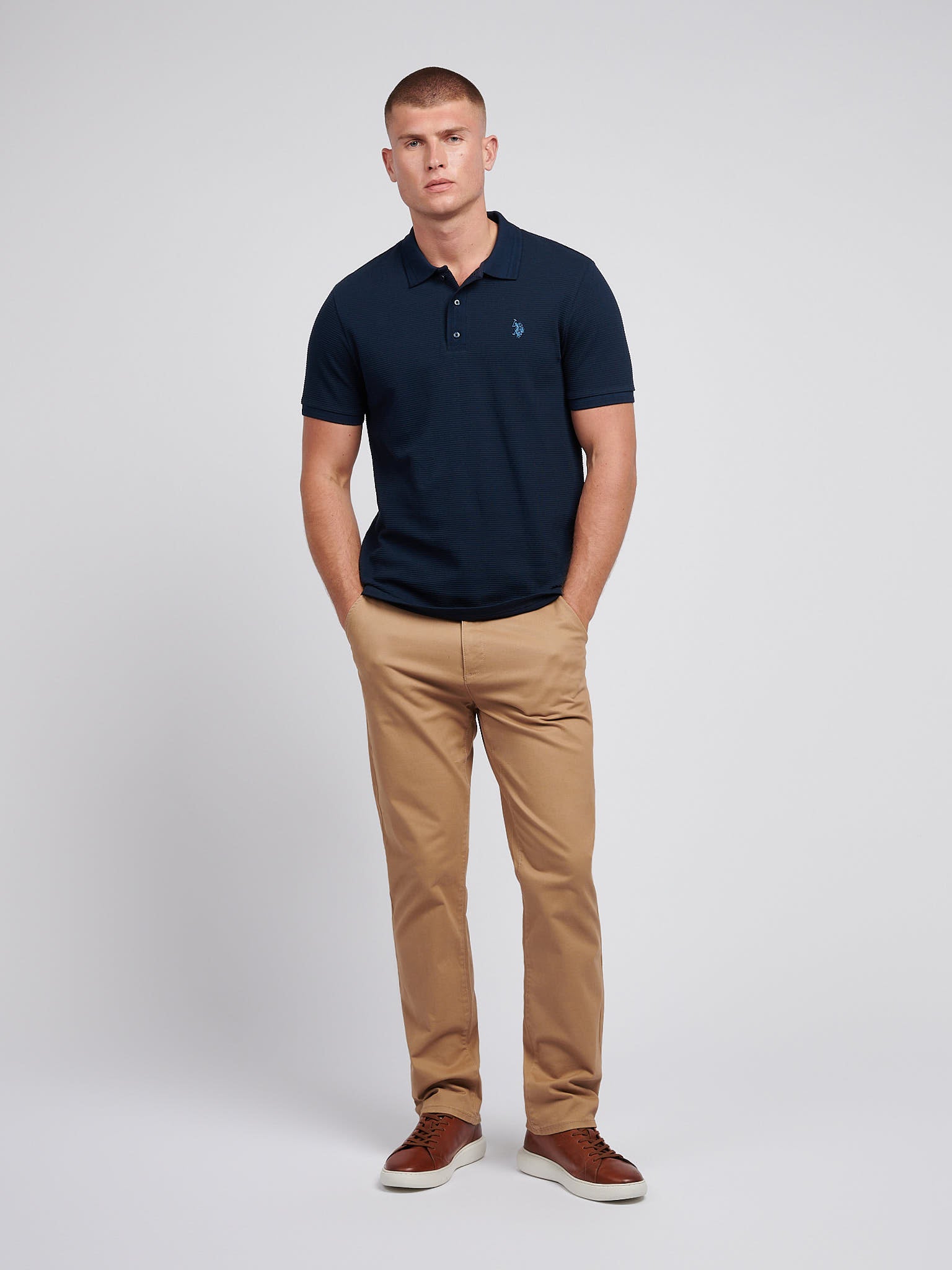 Embrace the epitome of timeless style with the U.S. Polo Assn. Mens Collar Interest Textured Polo Shirt, a masterpiece of sophistication and comfort. Featuring a knitted textured jersey and refined collar details, this polo is perfect for both casual gatherings and semi-formal events. Pair it effortlessly with tailored trousers or dark denim for a sophisticated yet relaxed look.