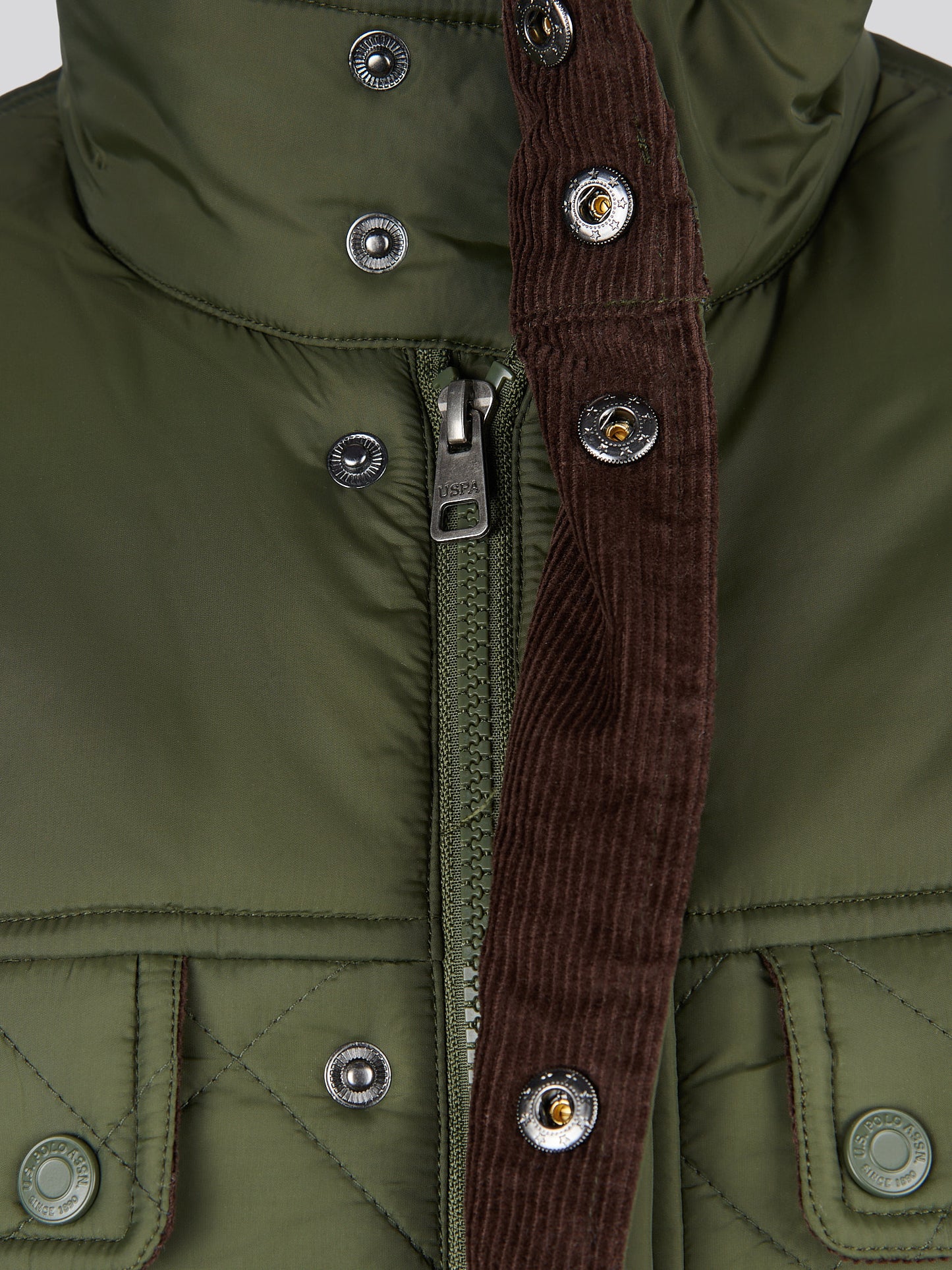 Crafted with a refined silhouette, the U.S. Polo Assn. Mens Diamond Quilted Funnel Jacket brings together heritage design and cold-weather practicality. From the diamond quilt body to the corduroy detailing and hidden zip pockets, every element has been carefully considered for timeless versatility. Style it with straight-leg chinos and leather boots for an effortlessly elevated winter look.