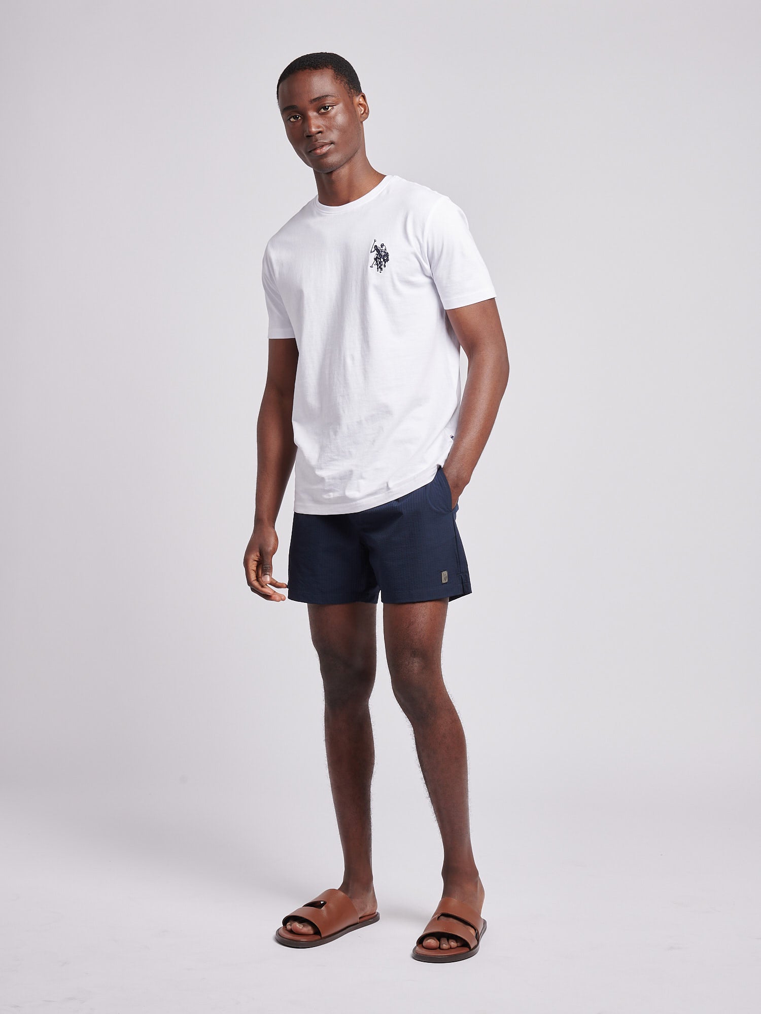 Stay stylish by the water with the U.S. Polo Assn. mens Seersucker Swim Short. Designed with a textured seersucker fabric and finished with a contrast drawcord, these swim shorts bring a touch of sophistication to beachwear. Pair with a classic polo or T-shirt for a relaxed, effortless look.