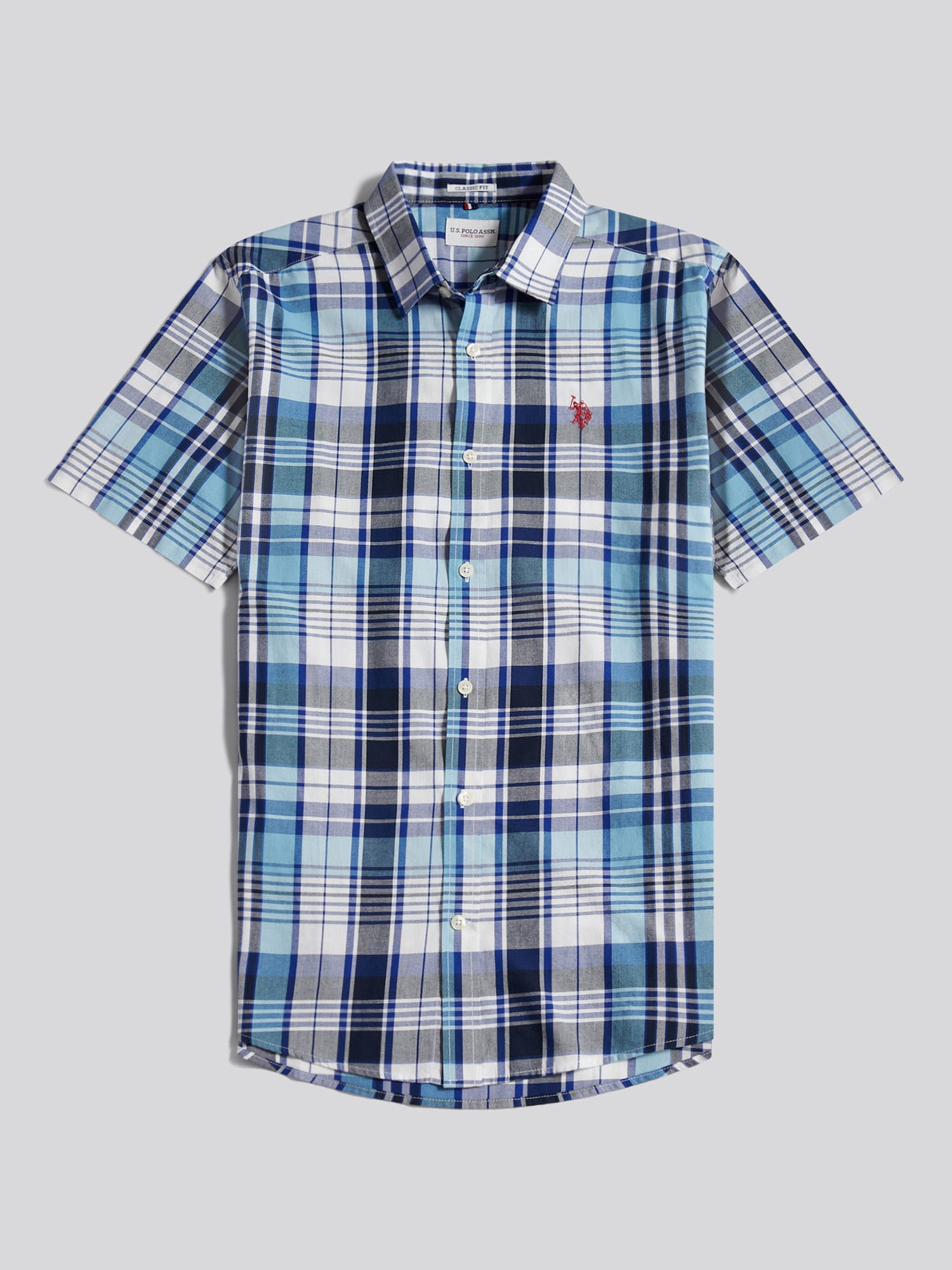Inspired by warm days around the polo grounds, the Mens Summer Madras Check Short Sleeve Shirt brings easy-going character to a classic U.S. Polo Assn. silhouette. Cut in a classic fit from breathable cotton madras check, it combines laid-back pattern with neat tailoring details, from the curved hem to the tricolour tape at the back neck. Wear it open over a T-shirt with shorts at the weekend or buttoned up with chinos and loafers when the dress code calls for relaxed smart.