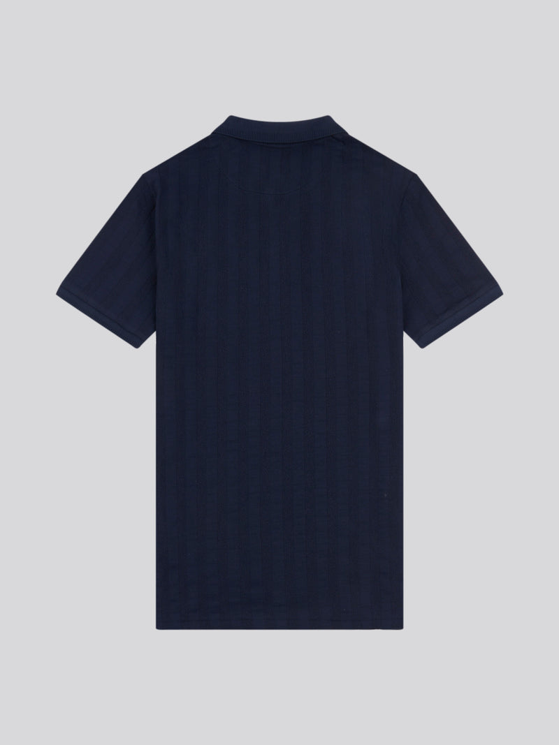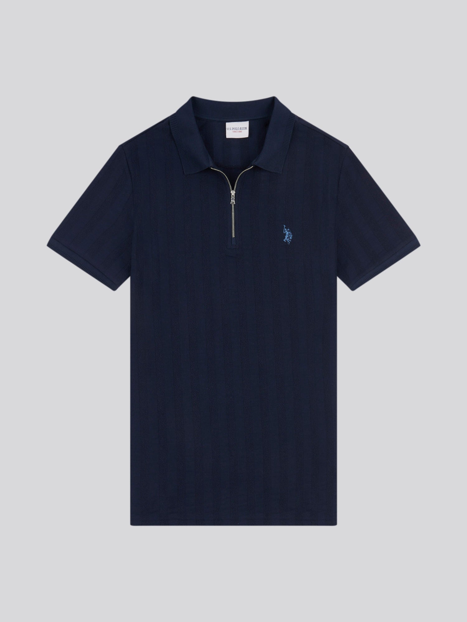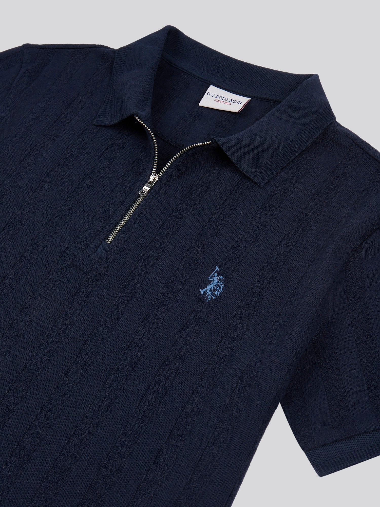 Mens Stripe Textured Zip Polo Shirt in Dark Sapphire Navy / Moonlight Blue DHM