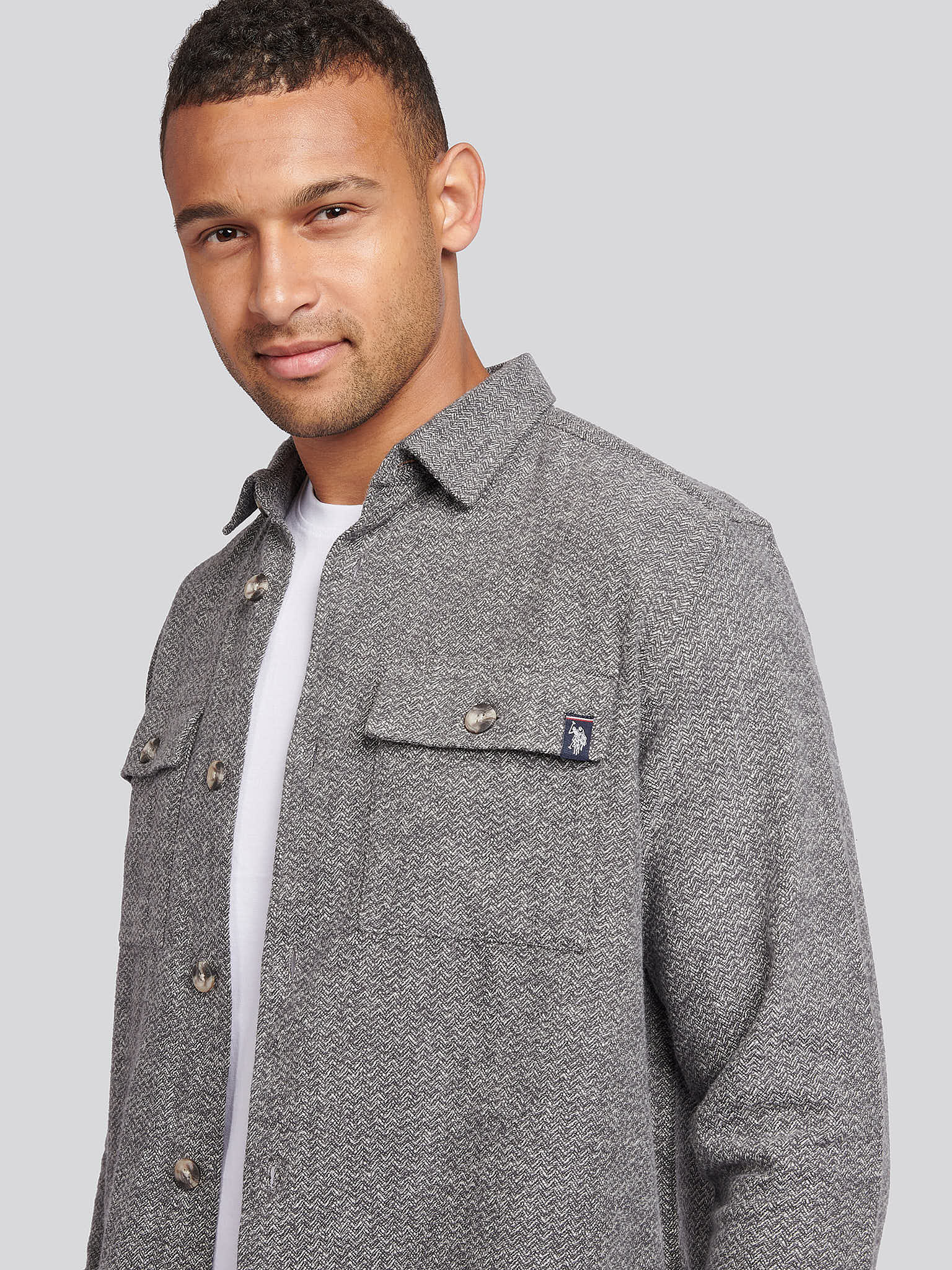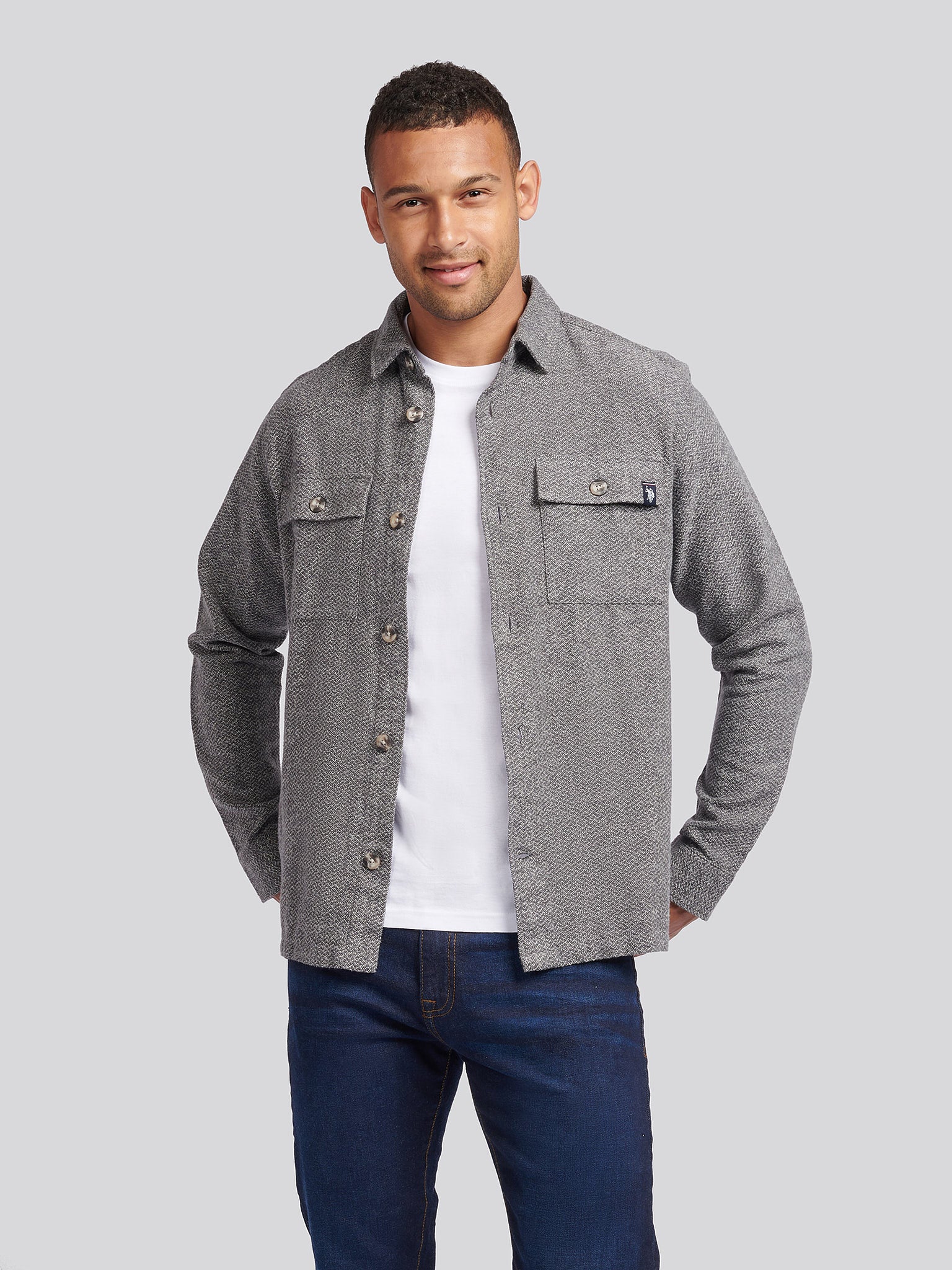 Mens Textured Herringbone Cotton Shirt in Mid Grey Marl