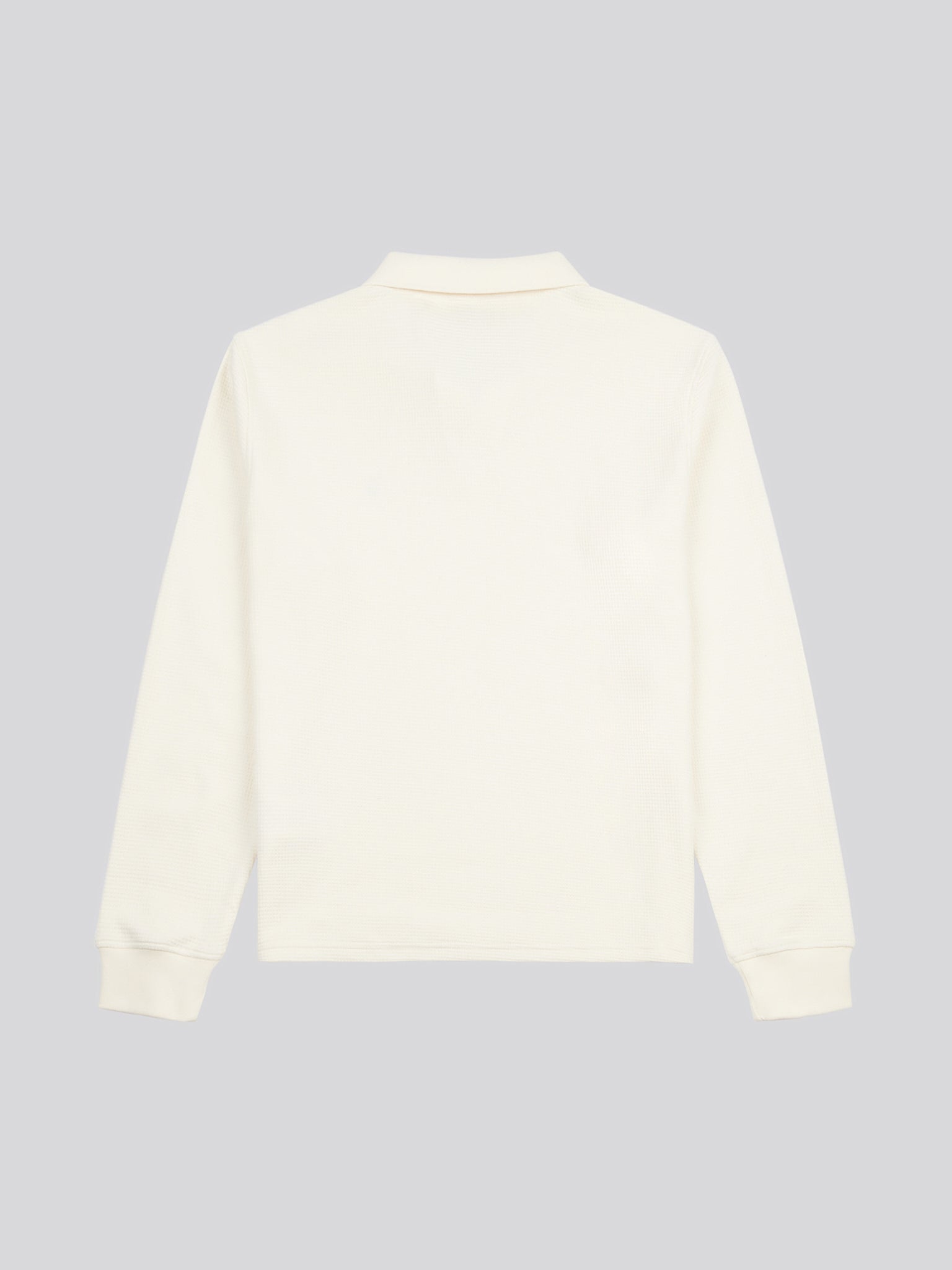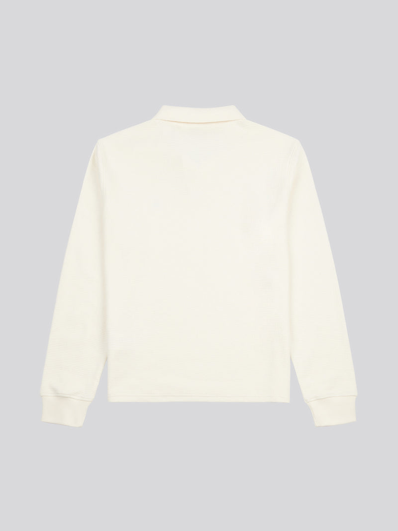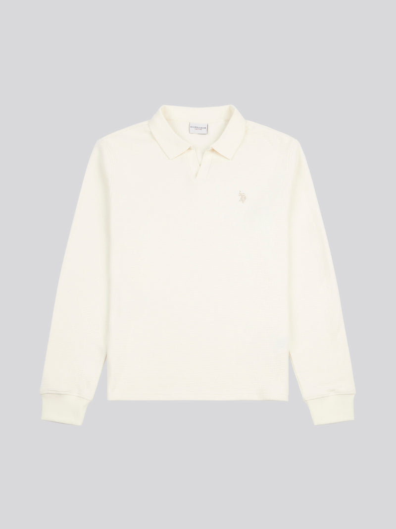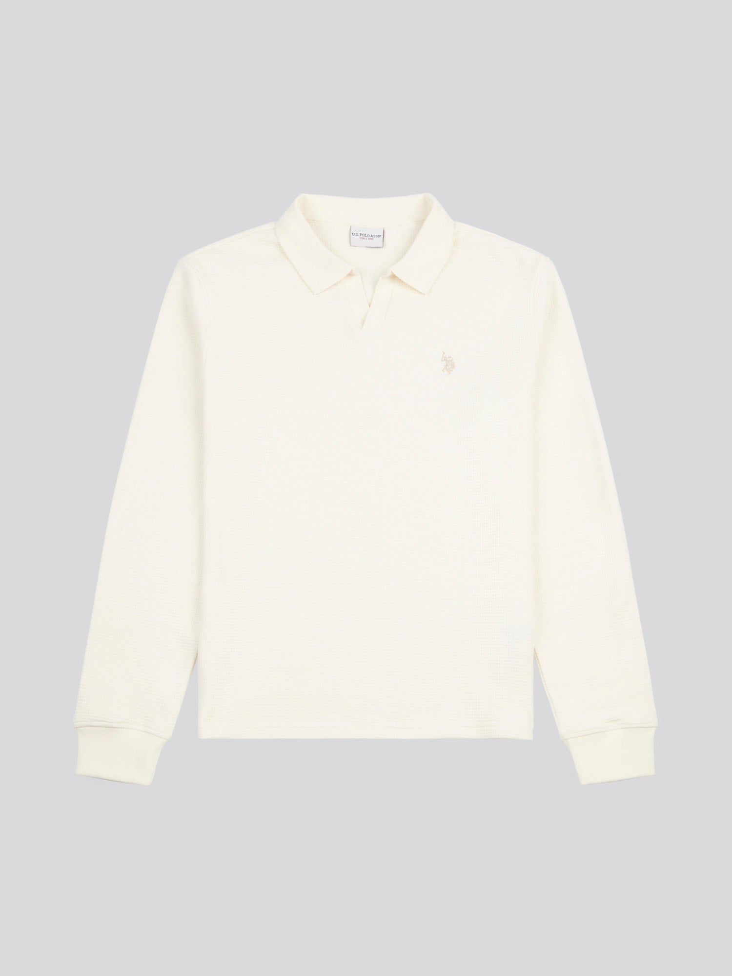 Mens Waffle Texture Open Collar Long Sleeve Polo Shirt in Whisper White