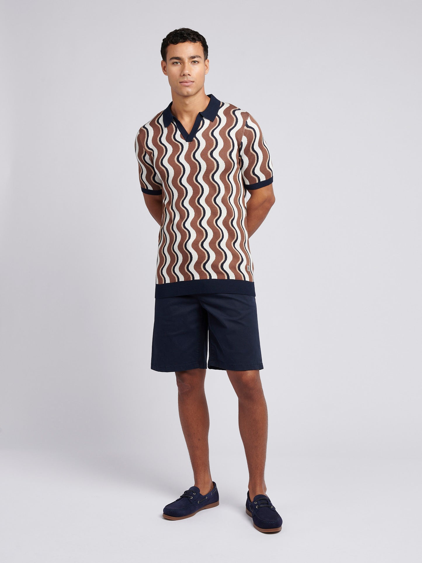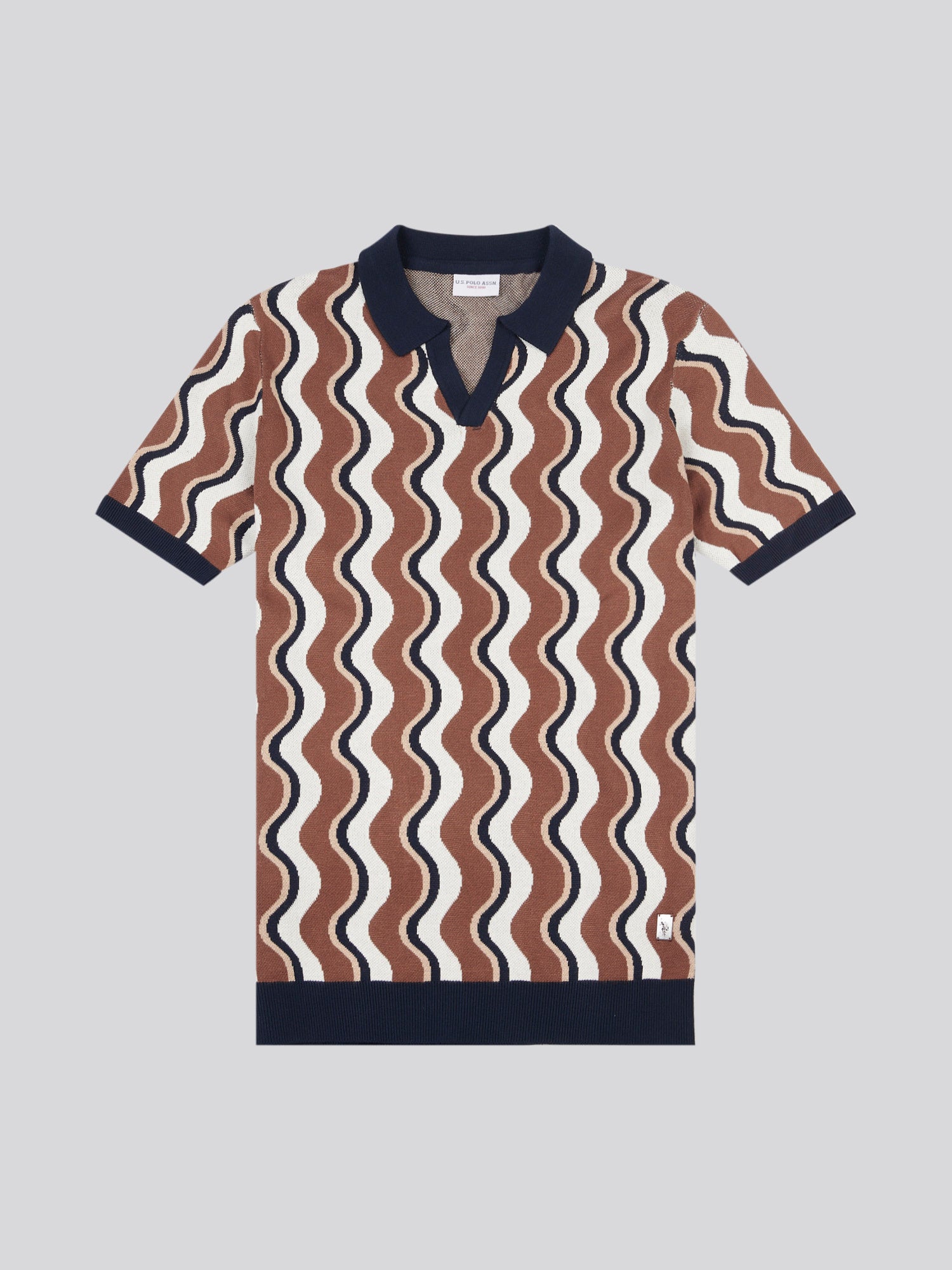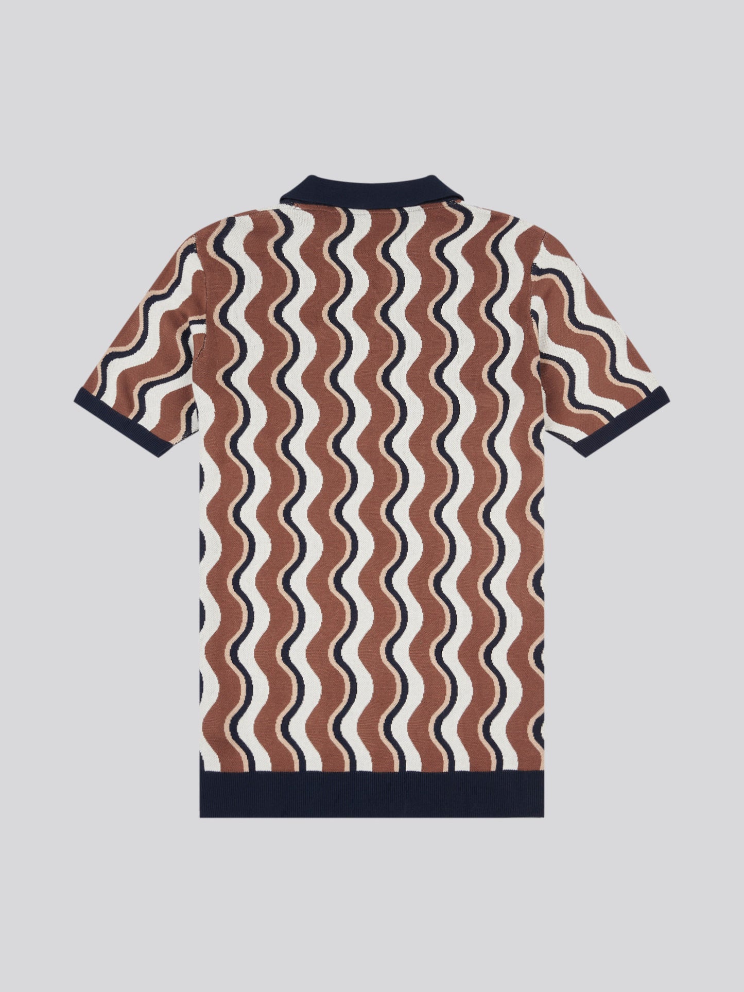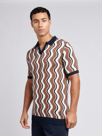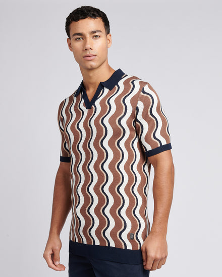 Mens Wave Knit Open Collar Polo Shirt in Cocoa Brown
