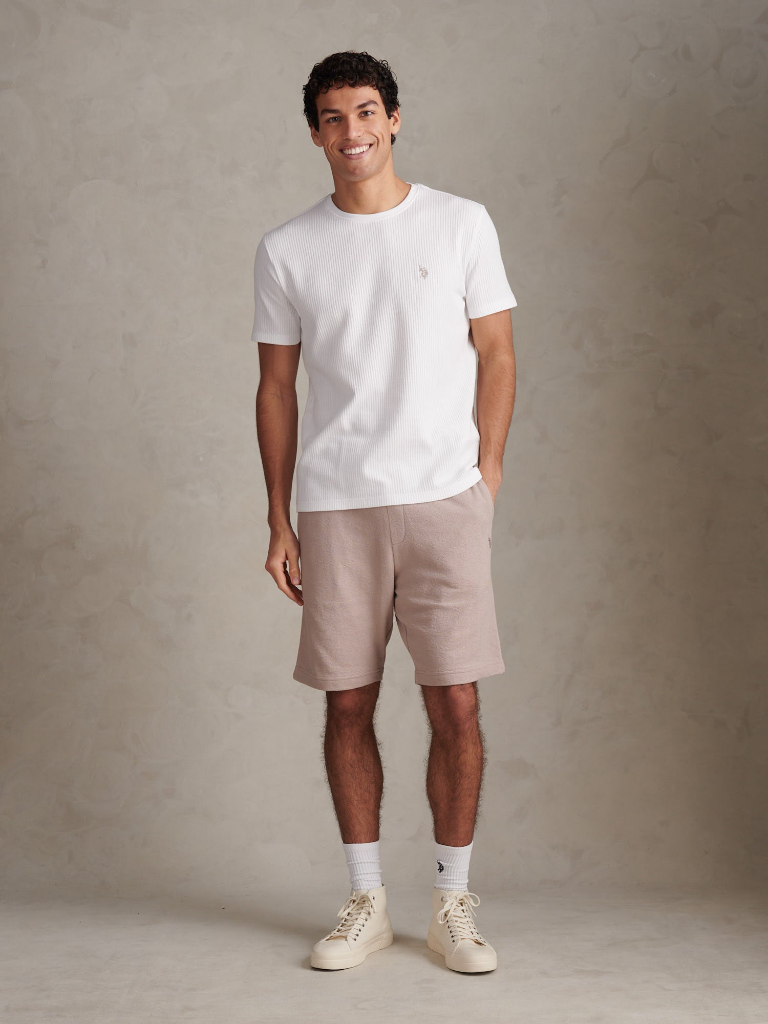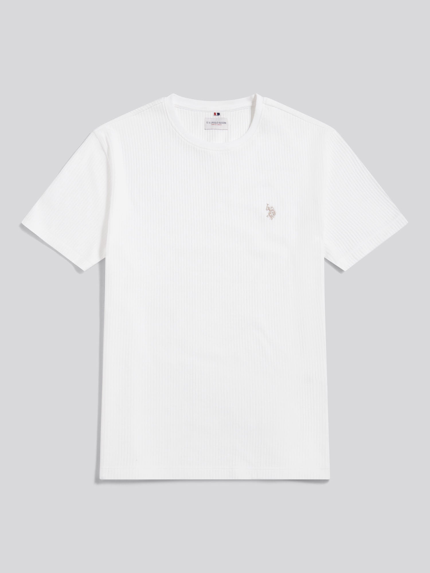 Bringing subtle texture to an everyday essential, the Mens Rib Texture T-Shirt channels U.S. Polo Assn.Õs sporting heritage into a clean, modern silhouette. Crafted from cotton rib jersey with a neat crew neckline, it is finished with Double Horsemen embroidery at the chest and a tri-colour tape detail inside the neck for a refined nod to the polo field. Wear it with relaxed denim, chinos or under a lightweight jacket when you want effortless polish with minimal effort.