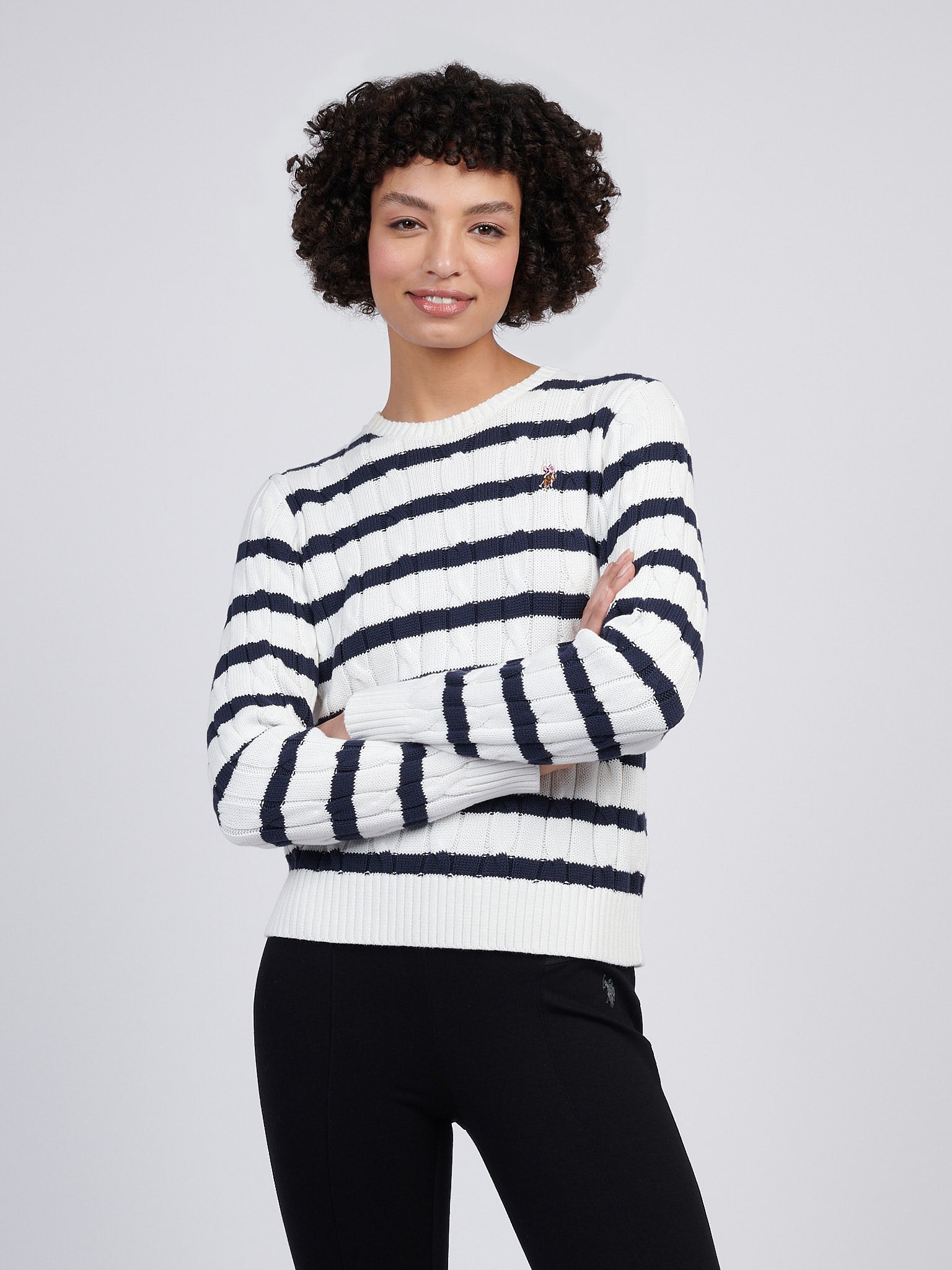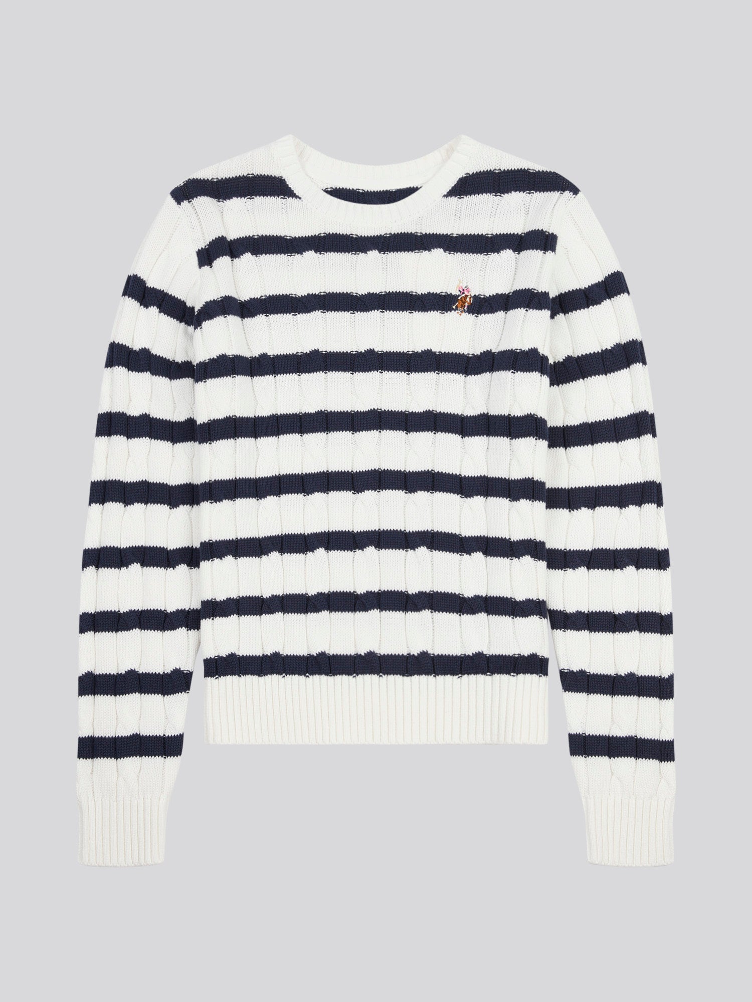 Elevate your layering options with the U.S. Polo Assn. Womens Thin Stripe Cable Knit Jumper. This timeless cable knit design, enhanced by thin stripes, brings a refined yet relaxed feel to your everyday style. Wear it with tailored trousers or denim for an effortlessly chic look.