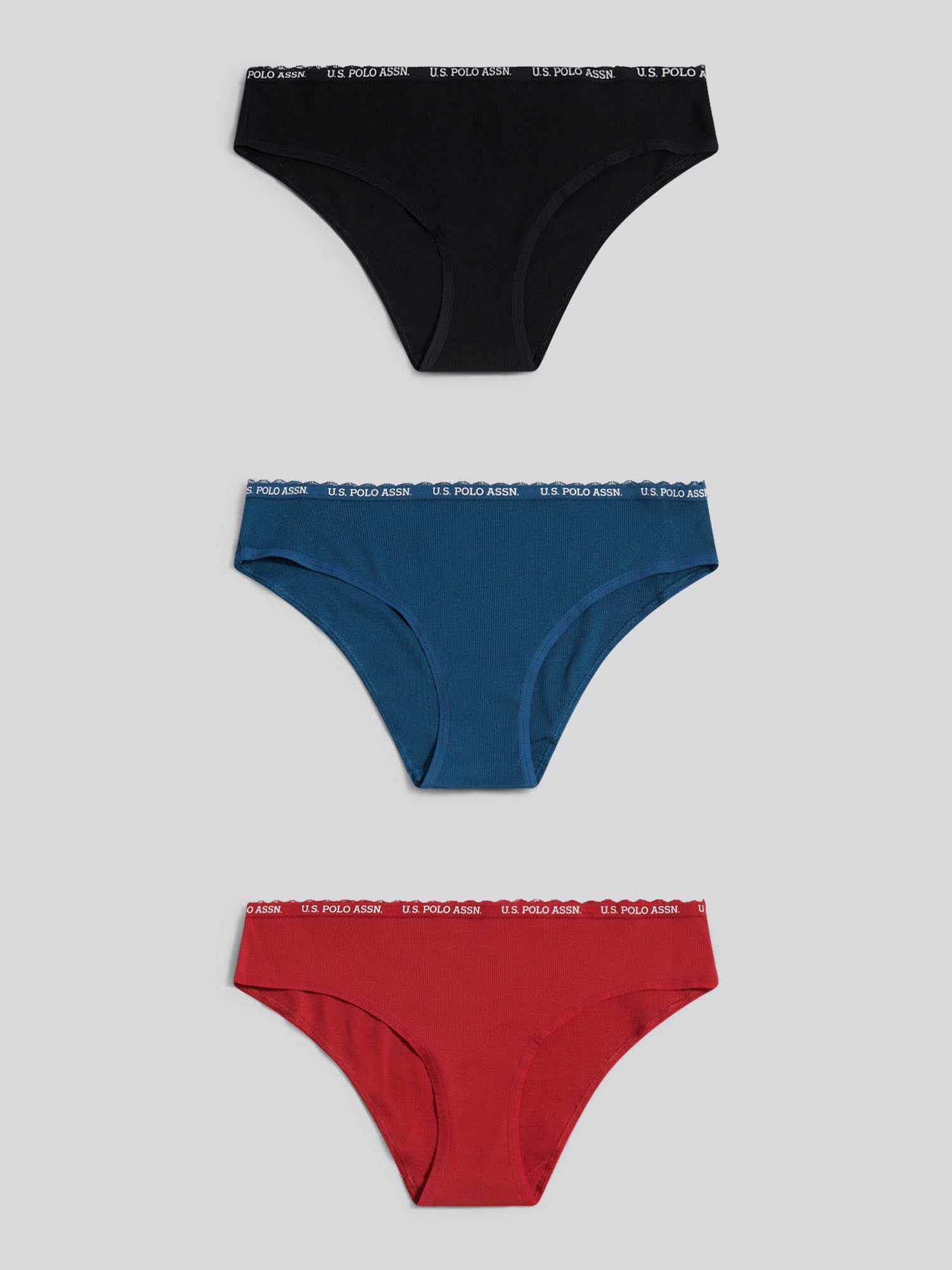 Blending everyday comfort with subtle detailing, the U.S. Polo Assn. 3 Pack Lace Trim Rib Bikini Brief brings a refined edge to a daily essential. Designed with a soft rib texture and delicate lace accents, it’s a style that feels just as good as it looks. Pair with the matching rib bralette for a coordinated base layer.