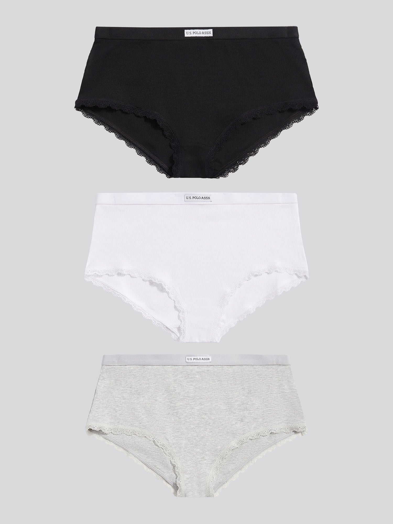 Elevate your everyday essentials with the U.S. Polo Assn. 3 Pack Lace Trim Rib Shortie. These ribbed shorties combine everyday comfort with refined femininity, finished with a delicate lace trim for a subtle, elevated touch. Style them under your favourite loungewear or denim for an effortless base layer that moves with you.