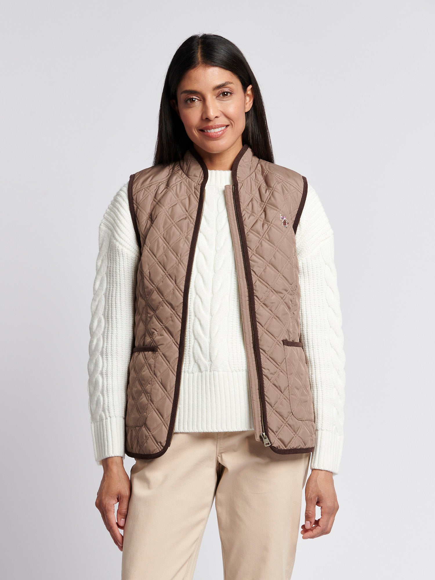 Inspired by heritage outdoor style, the U.S. Polo Assn. Womens Bound Quilted Hacking Gilet blends refined countryside charm with practical city wear. Diamond quilting and corduroy trims add texture and depth, while the shaped hem and back adjuster ensure an elevated silhouette. Style it over a knit jumper or tailored shirt for timeless layering in cooler weather.