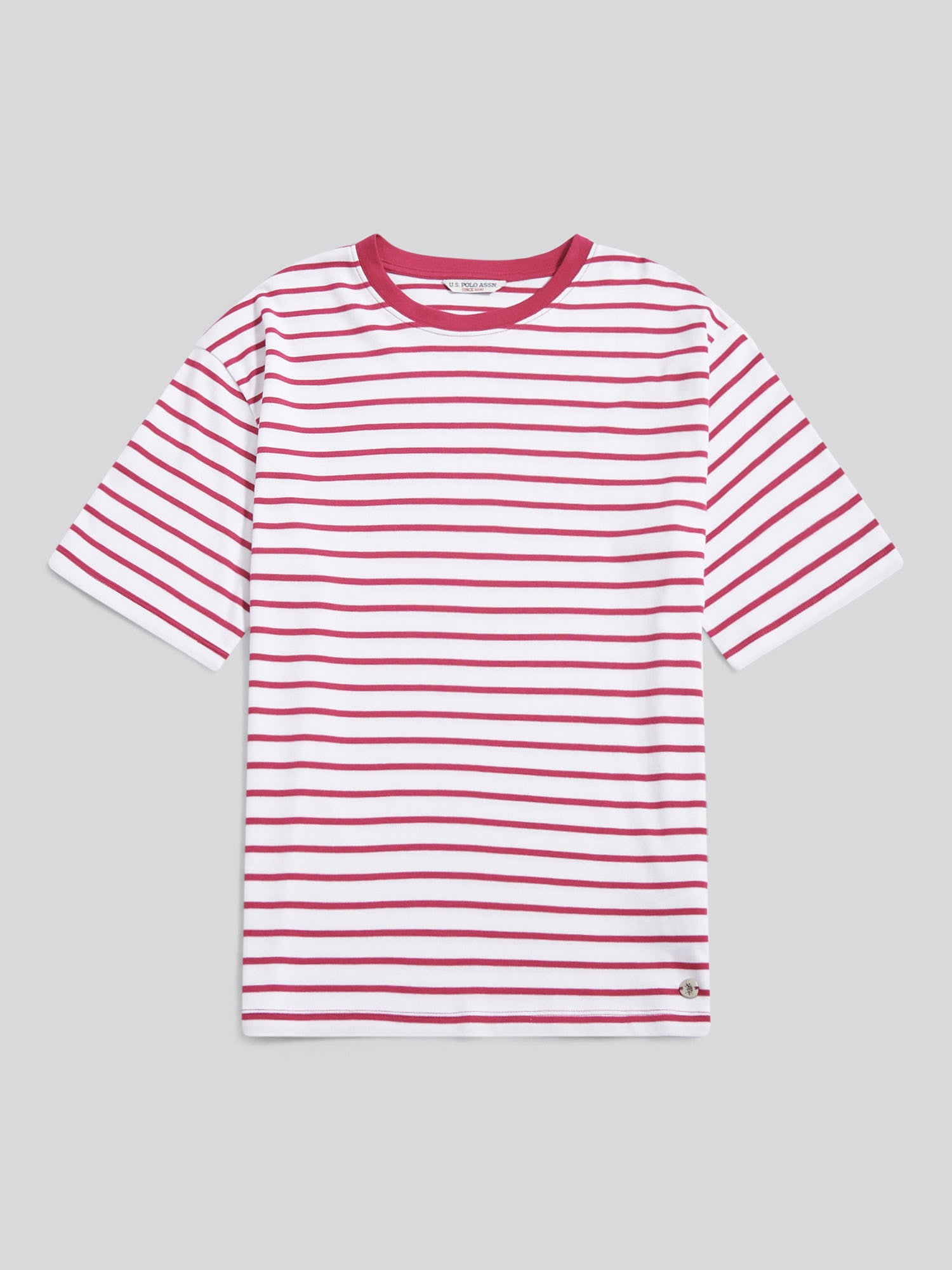 Strike the perfect balance between bold design and laid-back style with the U.S. Polo Assn. Womens Heavyweight Stripe Loose Crew Neck T-Shirt. Featuring broad yarn-dyed stripes and a relaxed silhouette, this piece brings an elevated edge to everyday dressing. Style it with slim denim or tailored shorts for effortless contrast.