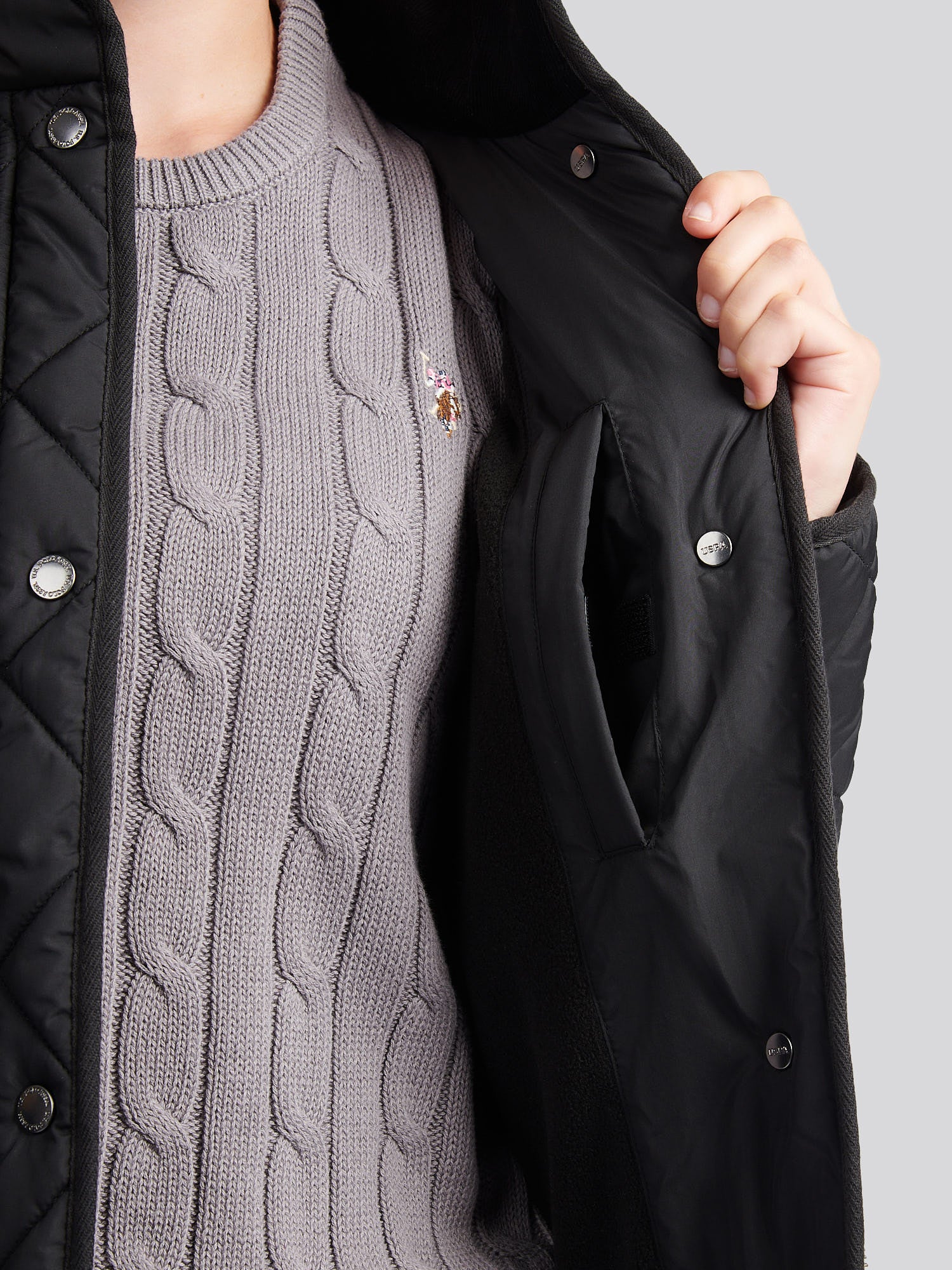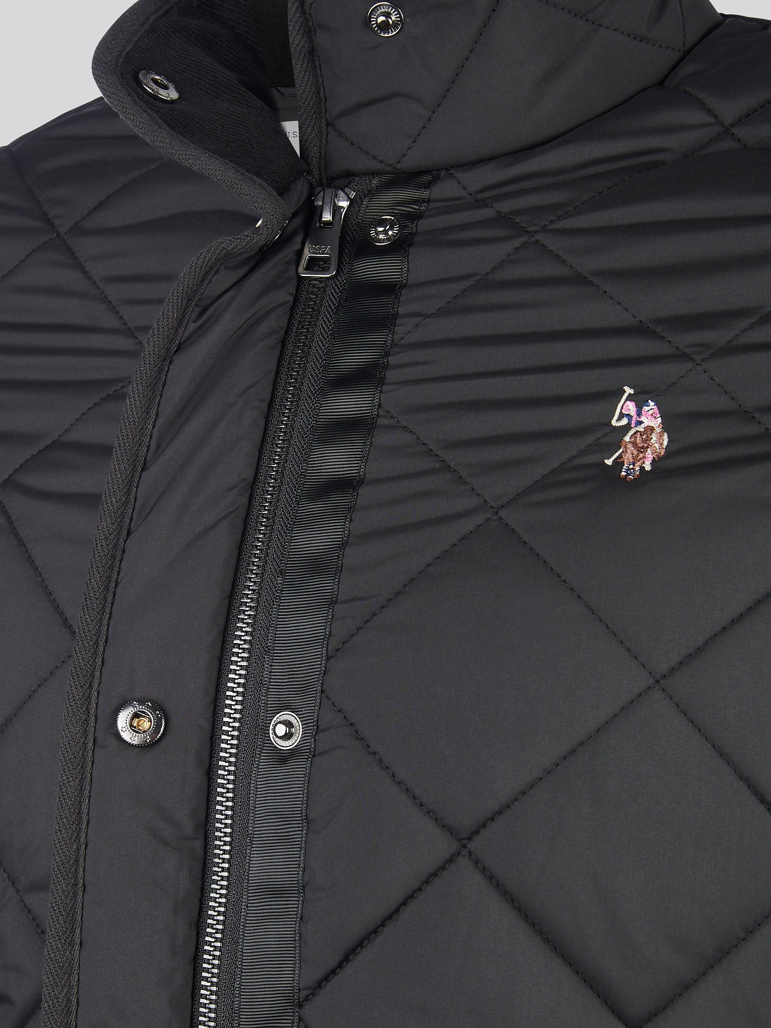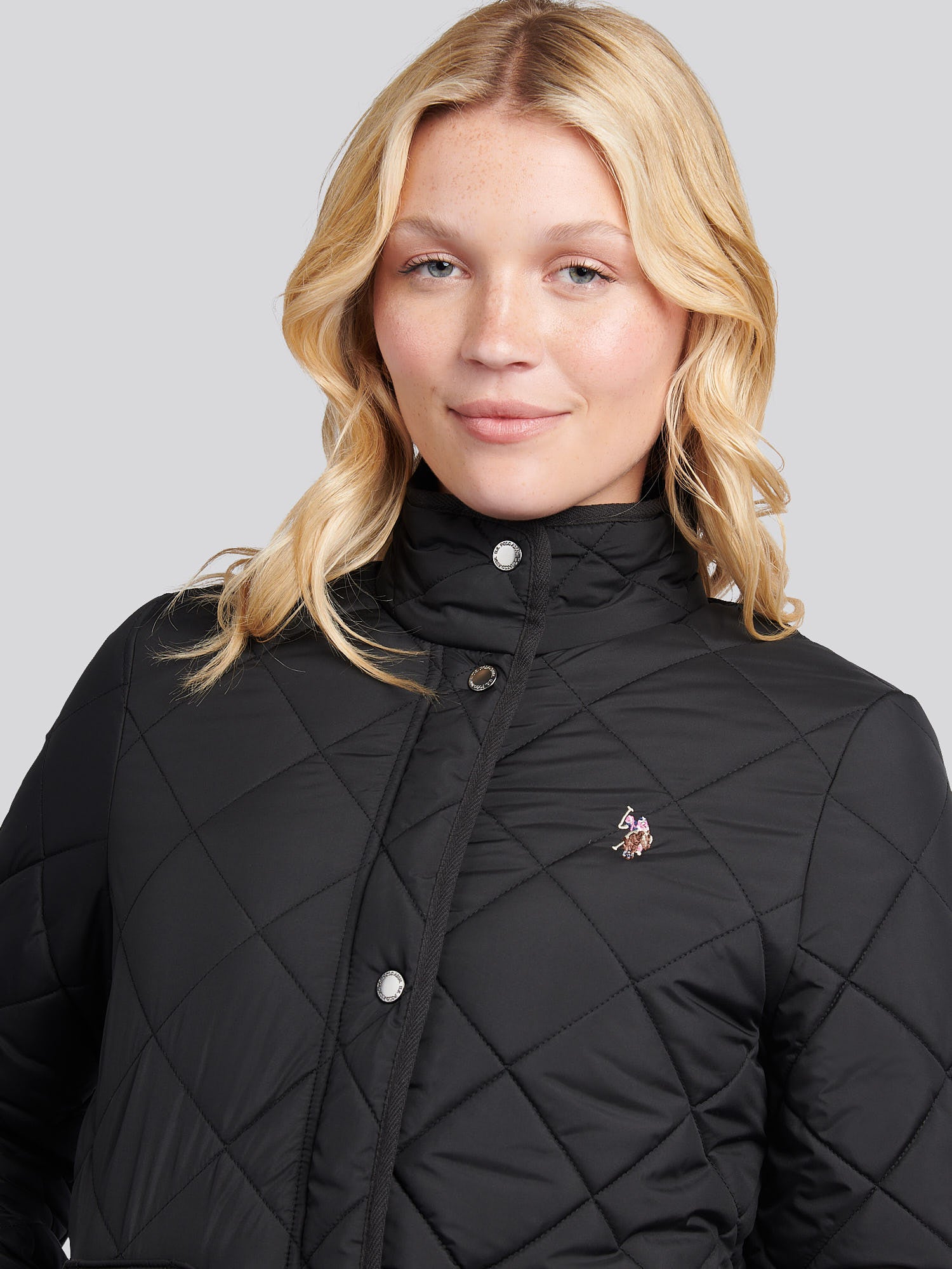 Designed to transition seamlessly from countryside strolls to city errands, the U.S. Polo Assn. Womens Lightweight Quilted Jacket brings elevated ease to cooler days. With a diamond quilted pattern and heritage-inspired detailing, it’s both functional and refined. Layer it over a roll neck and tailored trousers for a smart yet effortless seasonal look.