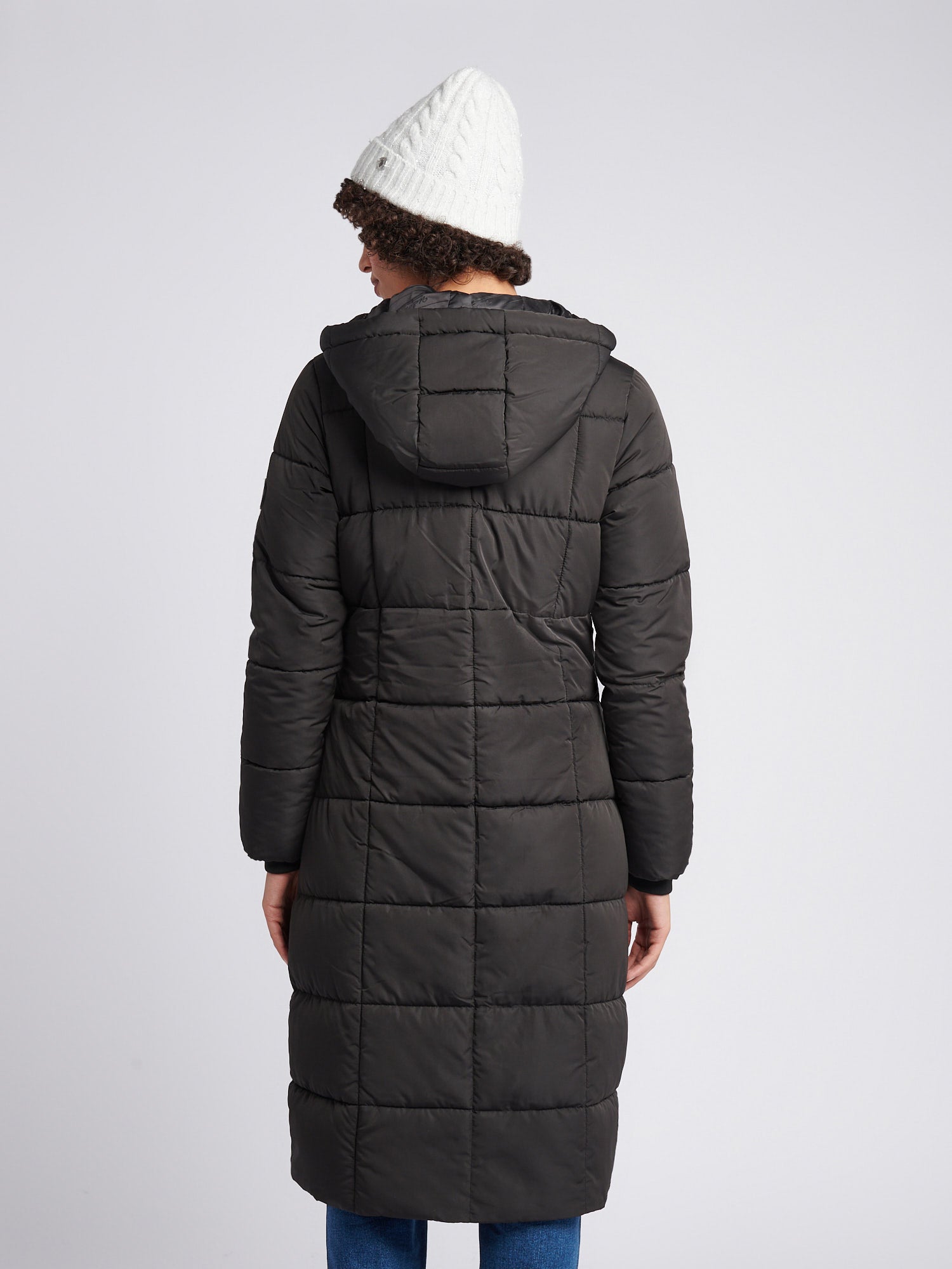 Womens Longline Square Quilt Puffer Coat in Black