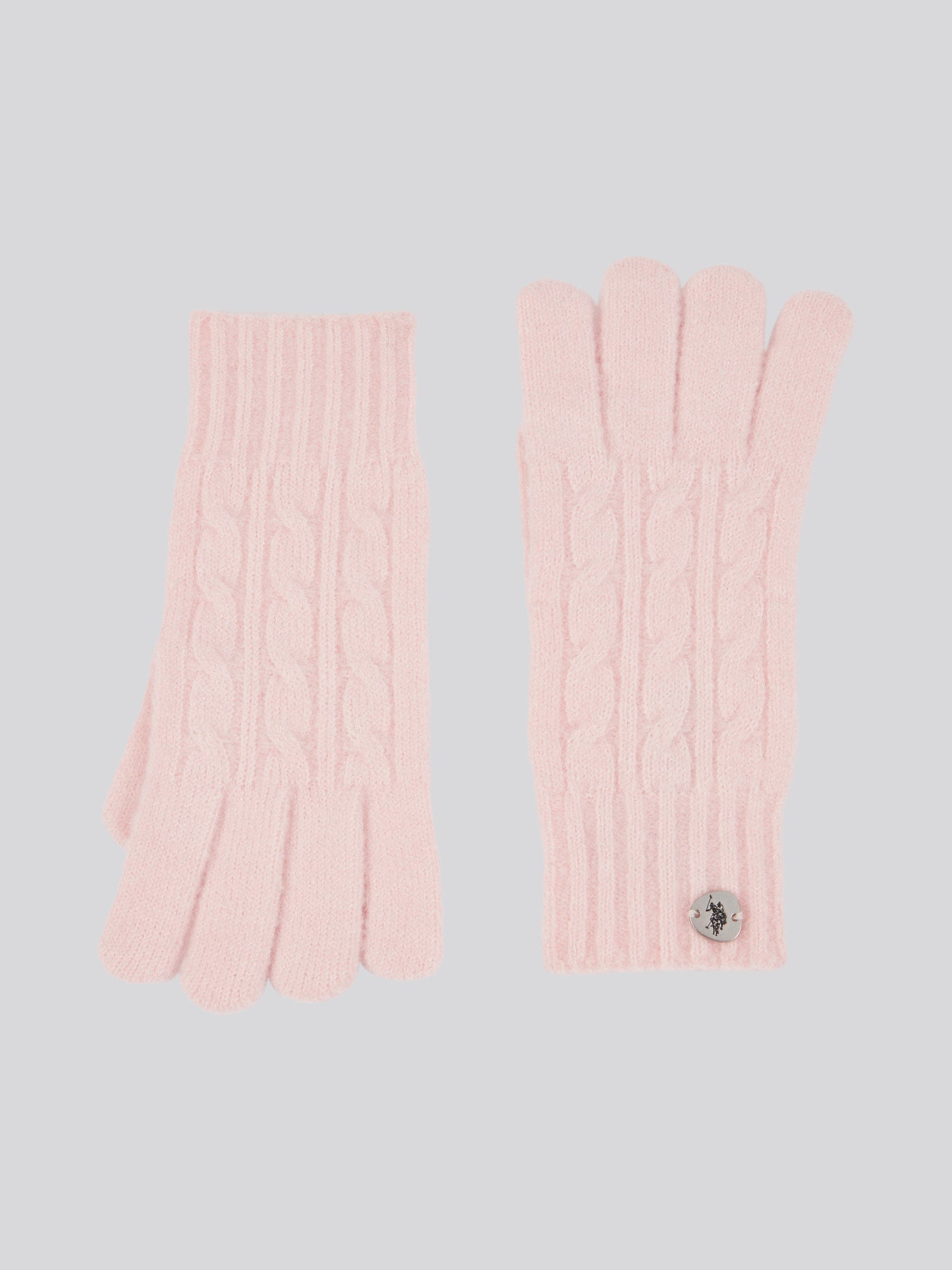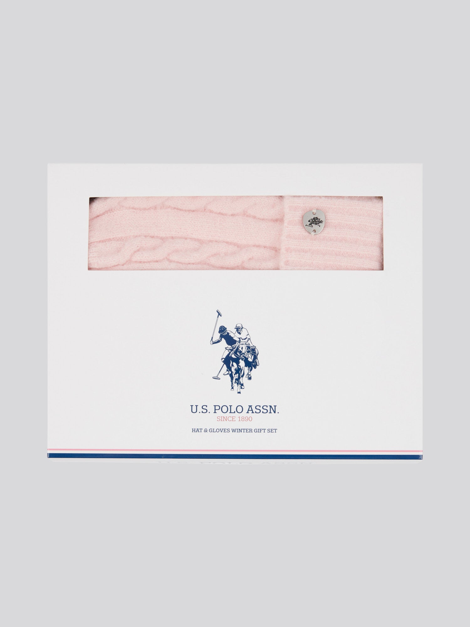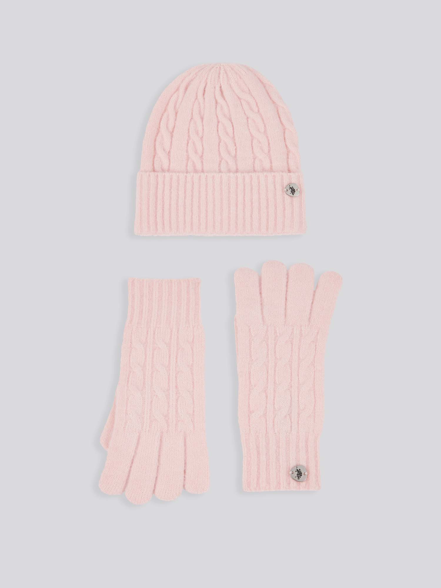 Womens Signature Cable Knit Beanie & Gloves Set in Crystal Rose