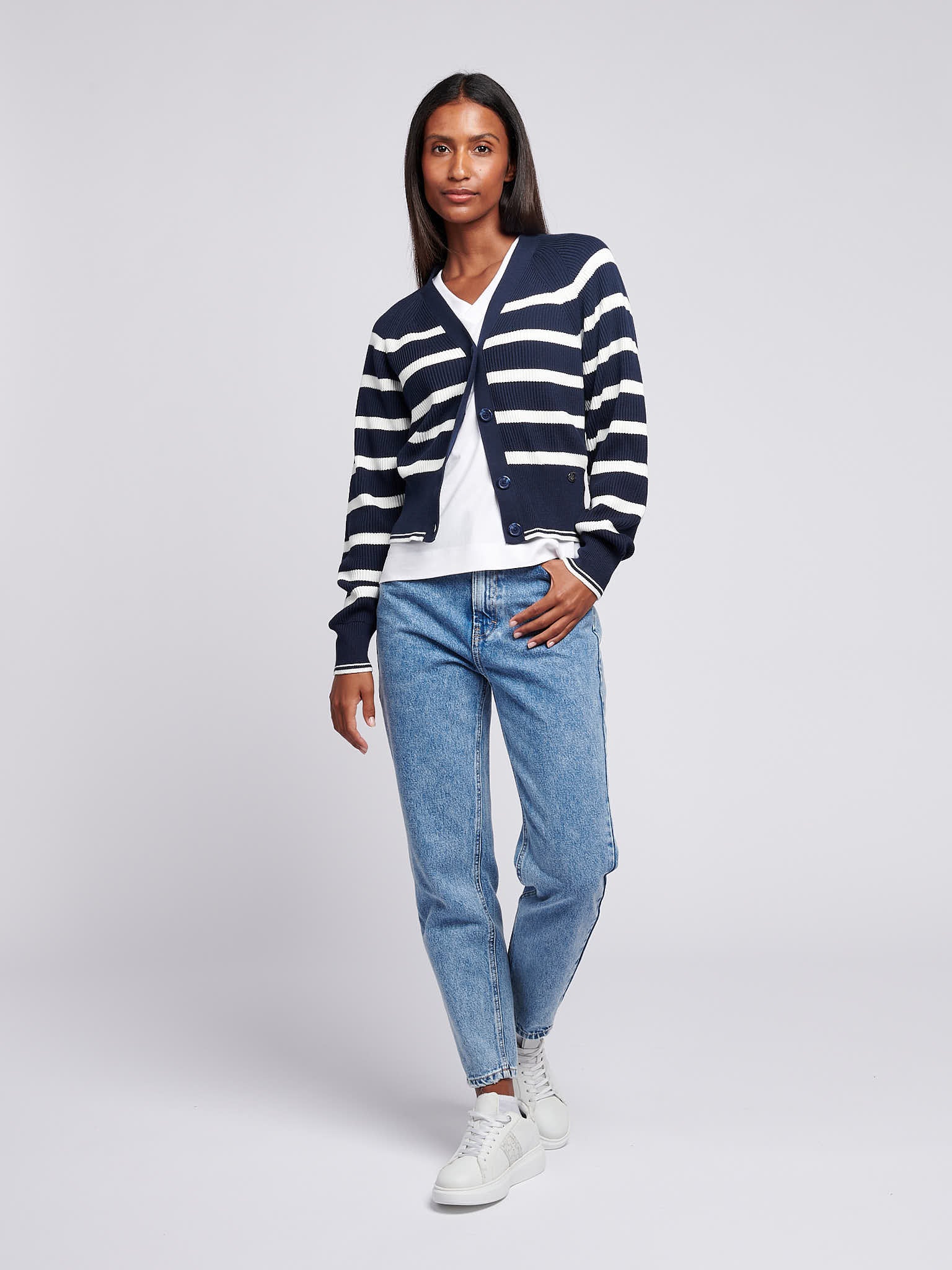 Womens Stripe Cropped Rib Cardigan in Navy Iris