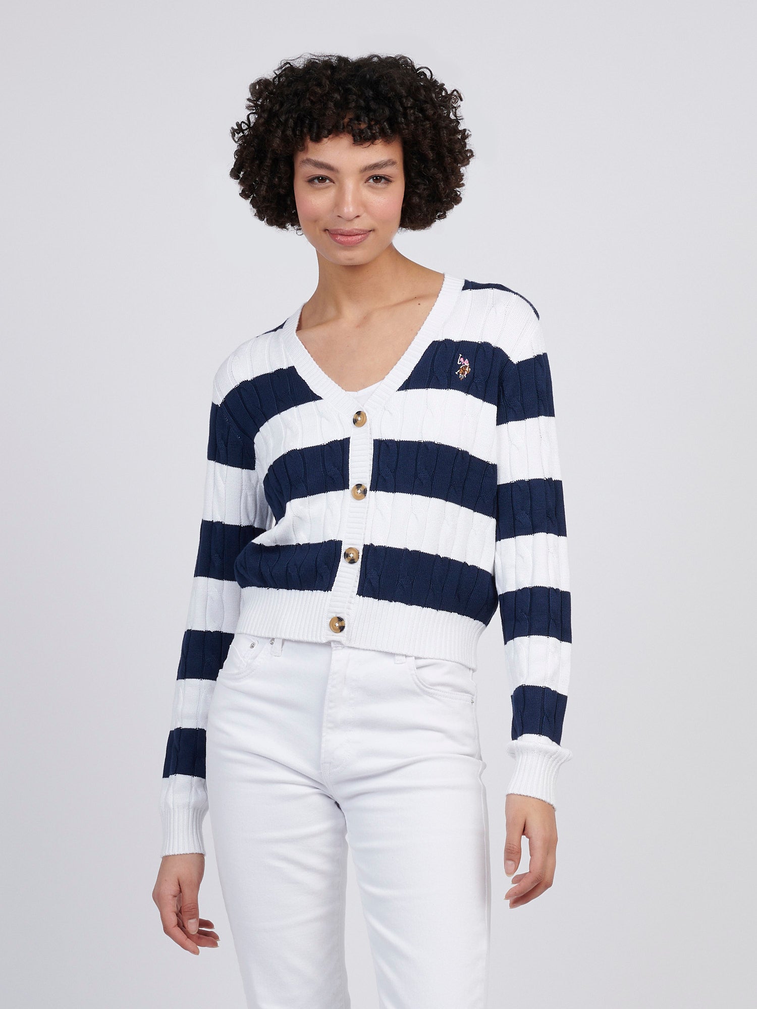 Indulge in timeless elegance with the U.S. Polo Assn. Womens Stripe Loose Cable Knit Cardigan. This relaxed, open-front style beautifully combines modern comfort with heritage charm, making it a versatile layer for any season. Pair it with denim or chinos for a sophisticated yet effortless look.