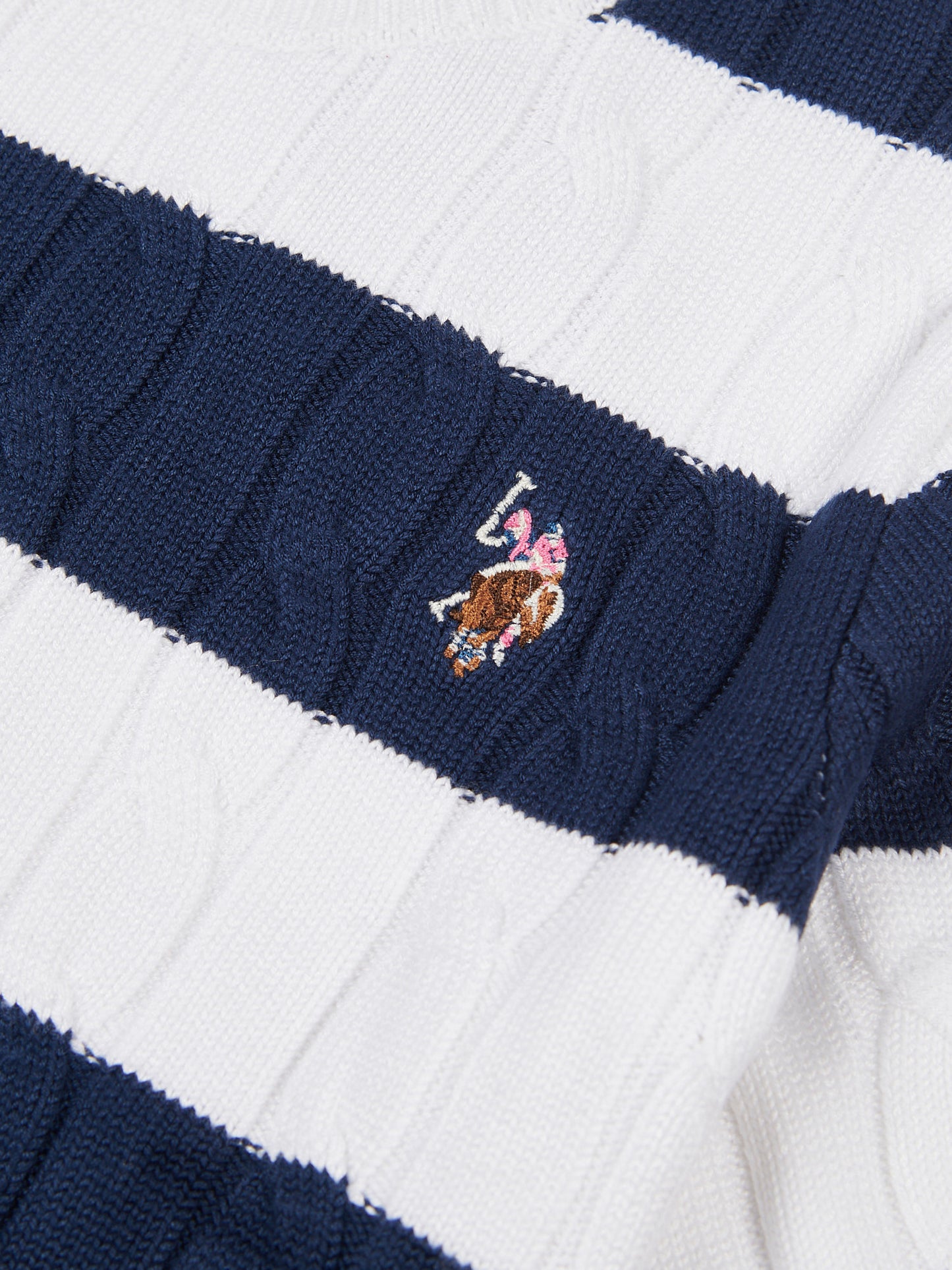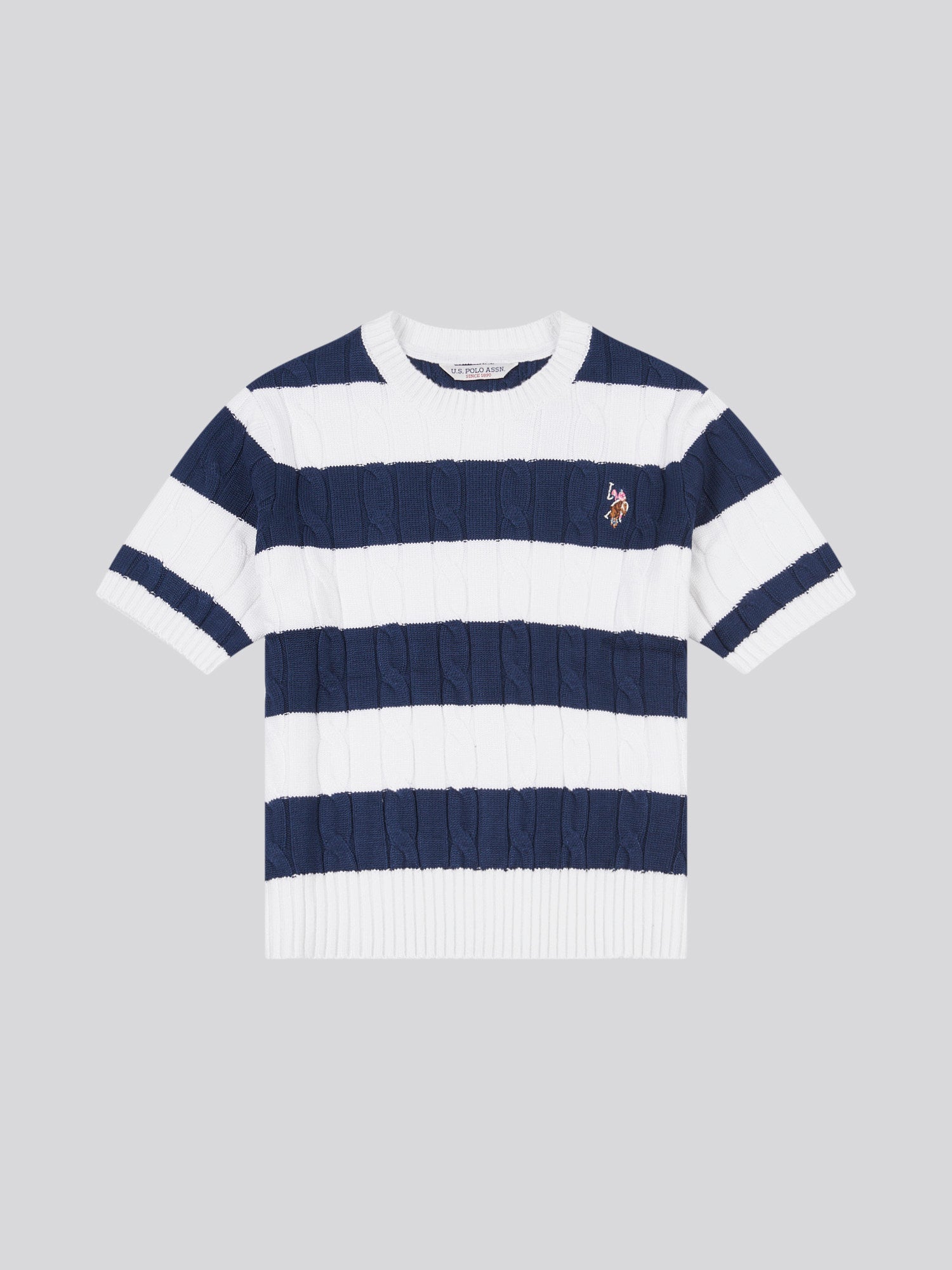 Embrace a blend of sophistication and relaxed style with the U.S. Polo Assn. Womens Stripe Loose Cable Knit Short Sleeve Jumper. Crafted with a classic cable knit and bold stripes, this piece adds a touch of elegance to any casual ensemble. Pair with high-waisted jeans or tailored trousers for a refined yet approachable look.