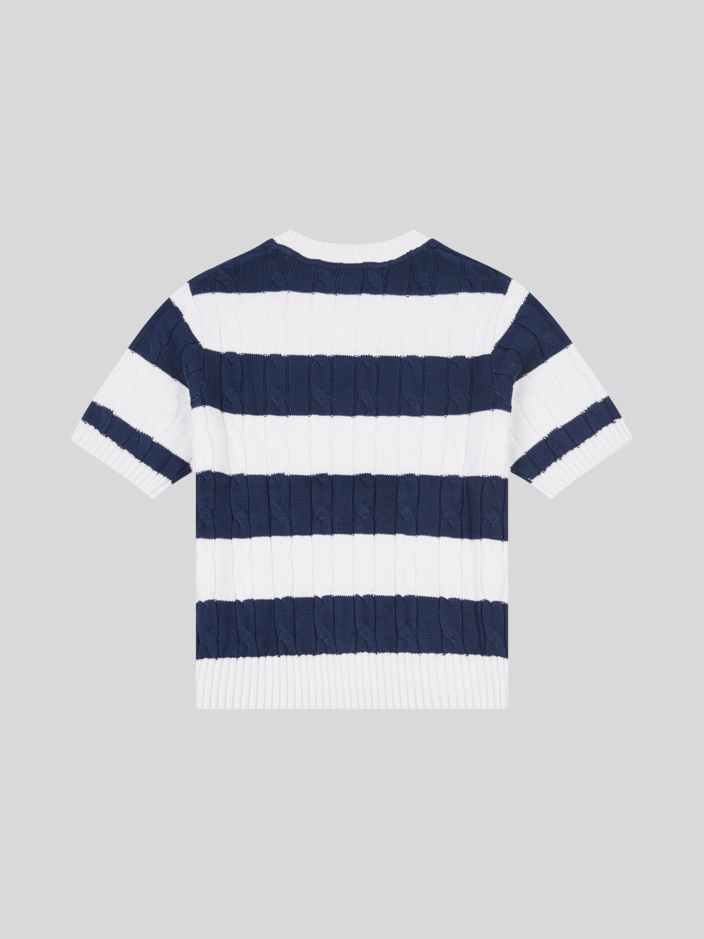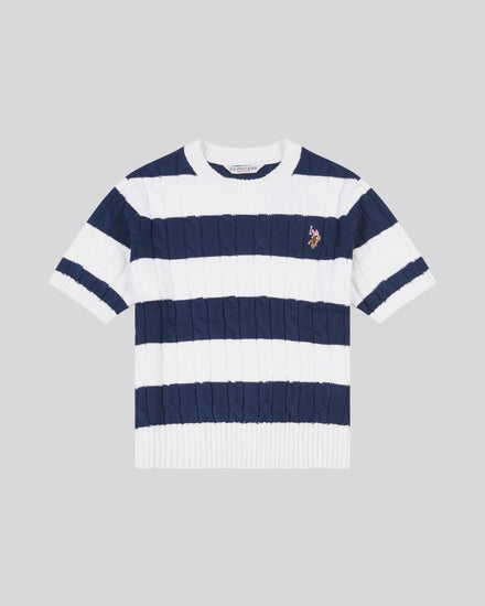 Womens Stripe Loose Cable Knit Short Sleeve Jumper in Navy Iris