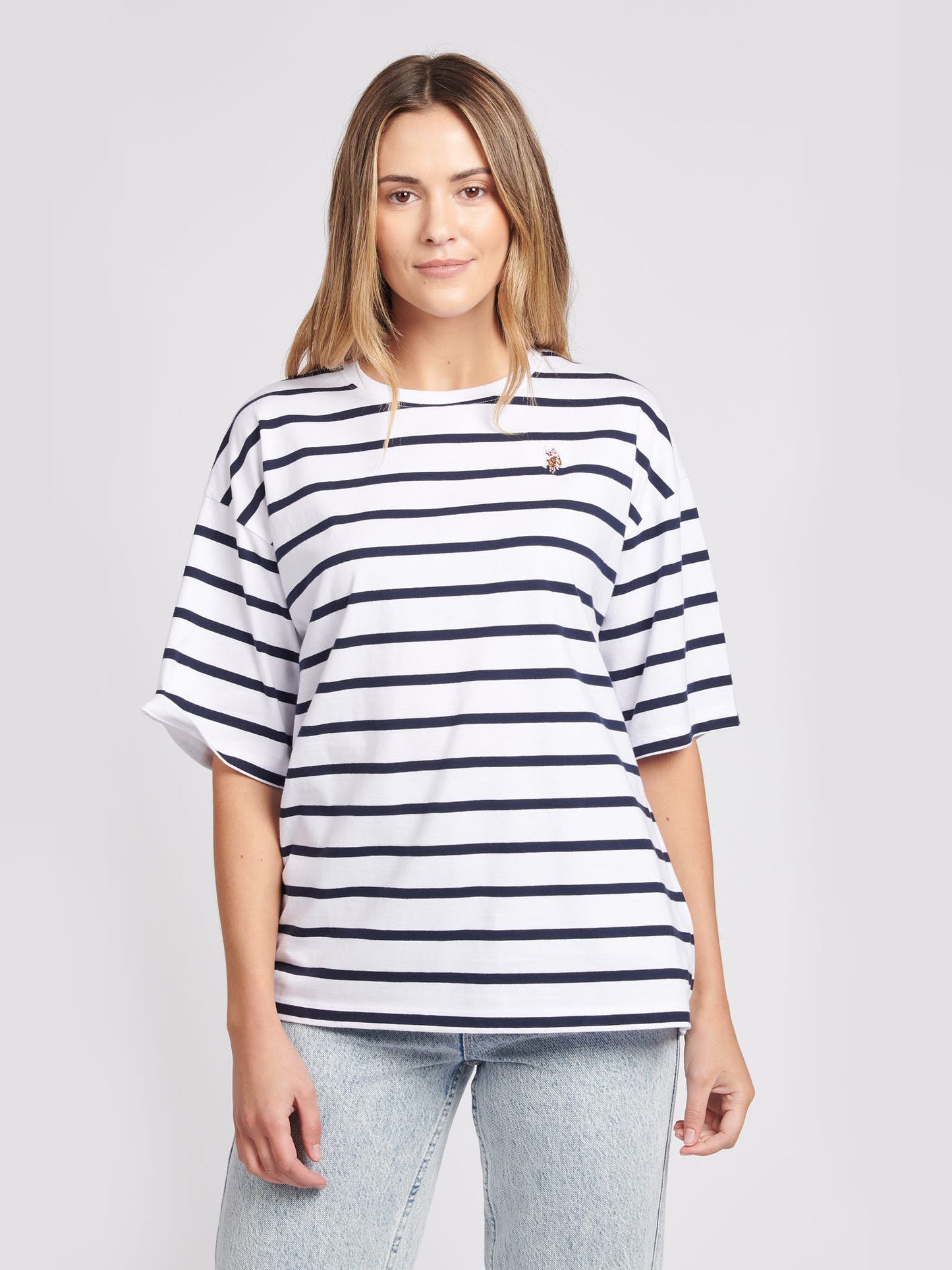 Introduce a touch of timeless style to your wardrobe with the U.S. Polo Assn. Womens Stripe Loose T-Shirt. Made from soft, yarn-dyed cotton, this relaxed tee features a classic stripe design and the iconic Double Horseman emblem for effortless, refined appeal. Pair with jeans or shorts for a casual, versatile look.