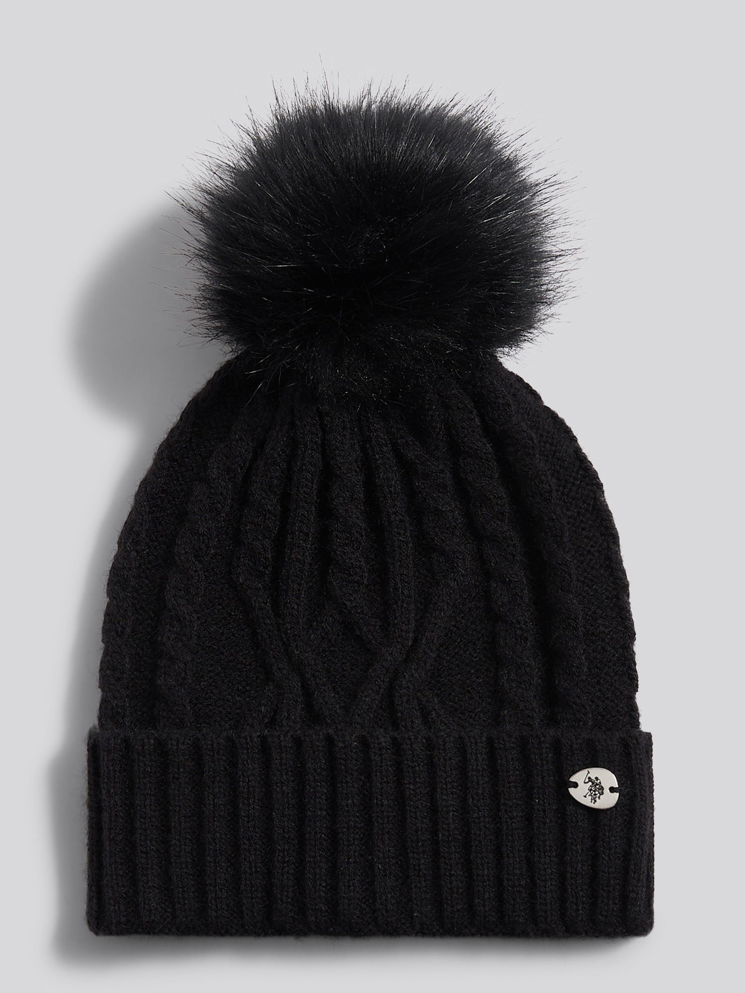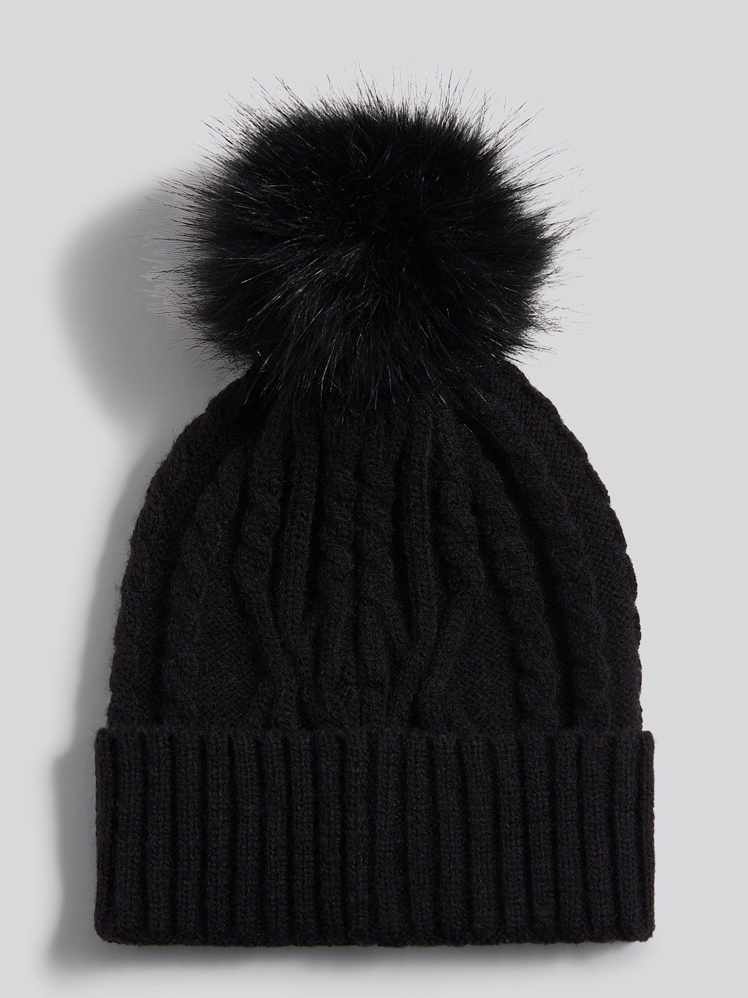 Womens Twist Cable Fur Bobble Knit Beanie in Black